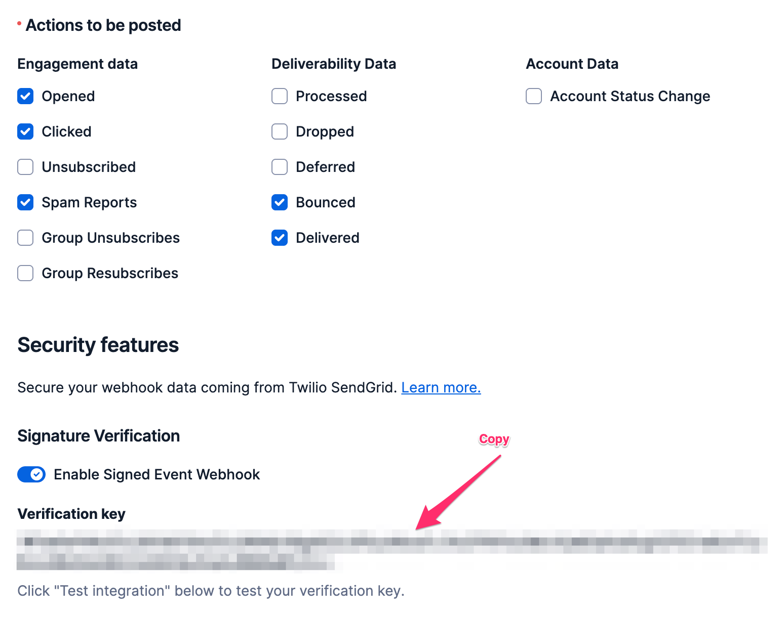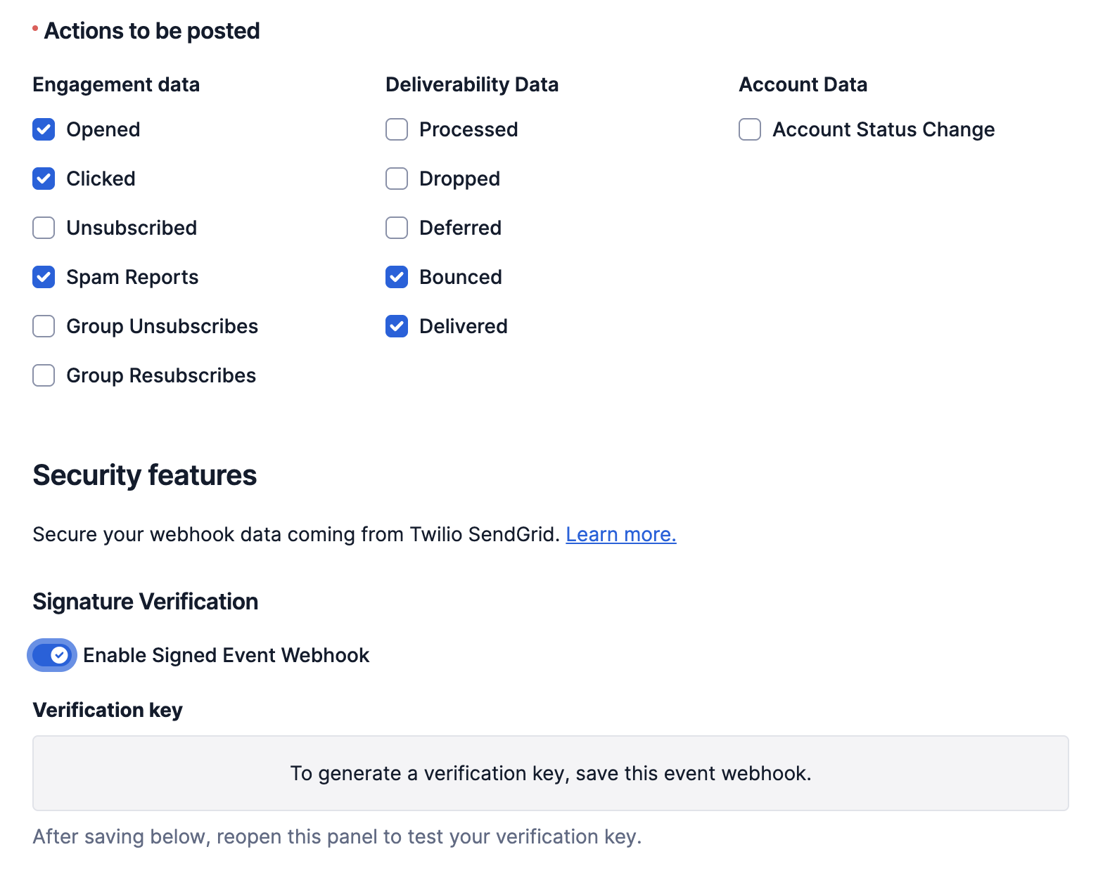 Visit the API Keys page in SendGrid. Click on the Create new Webhook button. Paste the URL copied from Step 5.