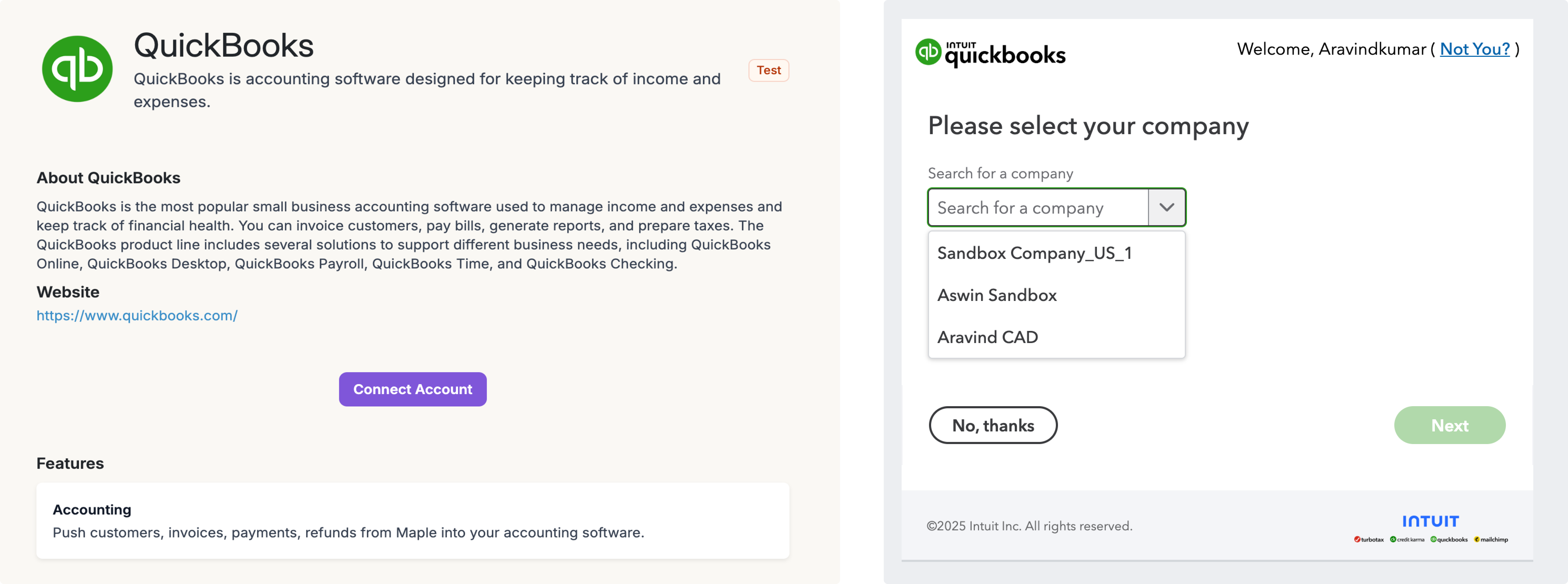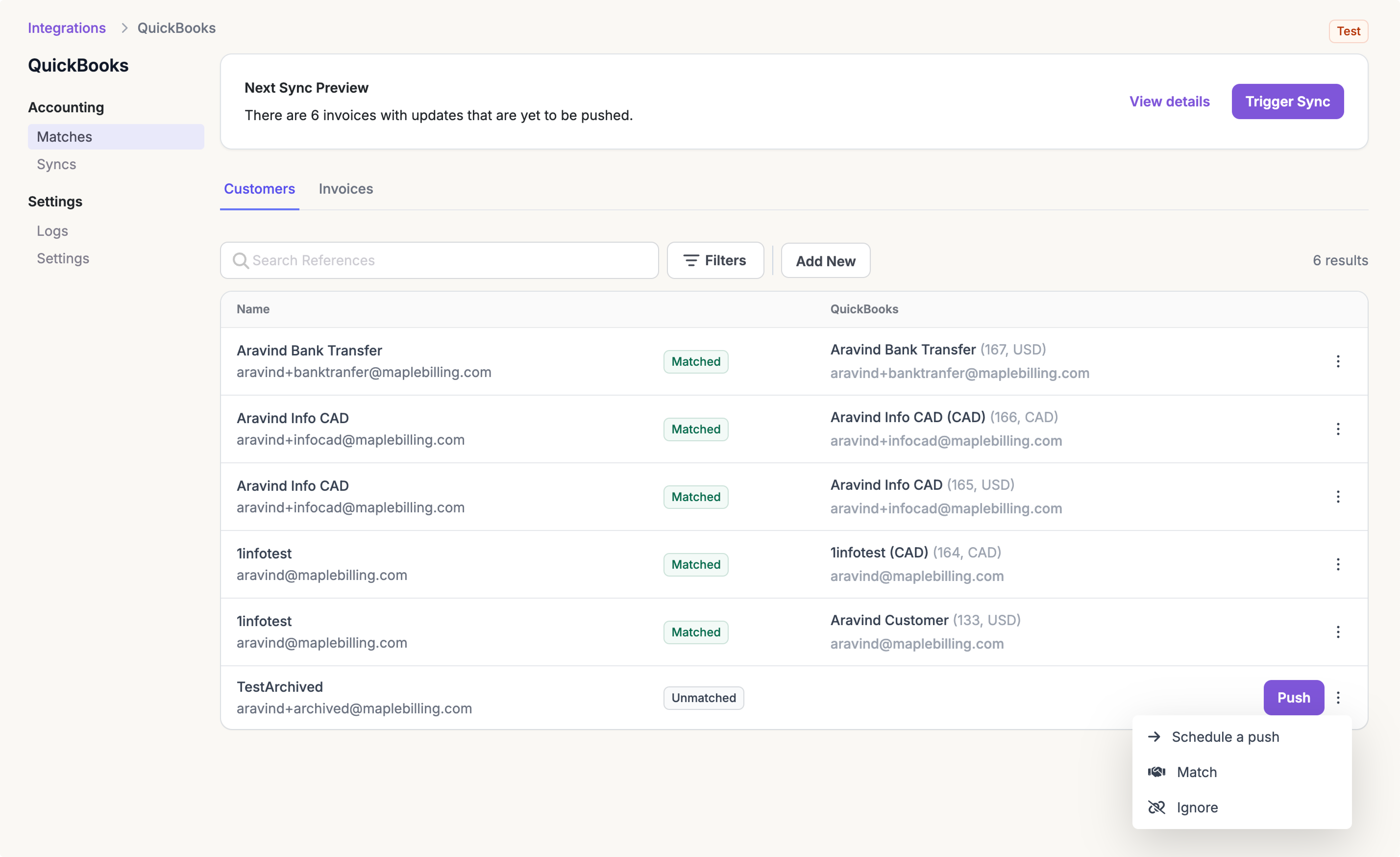 Maple allows you to easily map customers in Maple to those in QBO. Once the QBO account is connected,