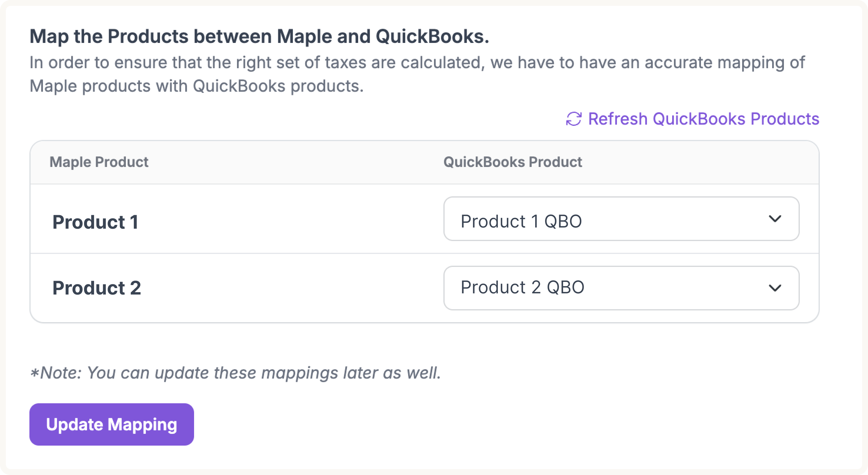 To map Maple products, select the QBO product for each Maple product and update the mapping.