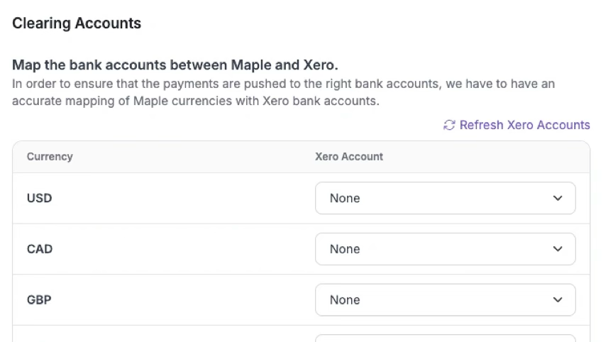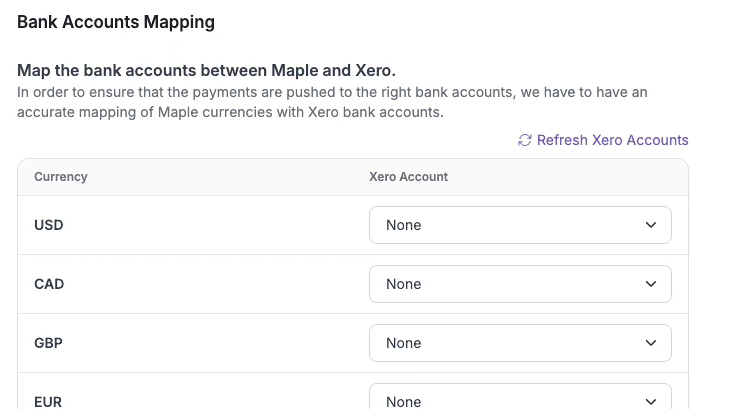 Match the different currencies in Maple to your deposit accounts in Xero.