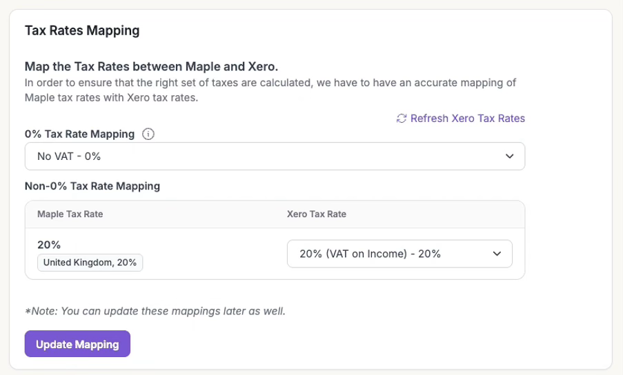 Maple allows you to easily map the taxes setup in Maple with Xero. This ensures that invoices and their line items are pushed correctly.