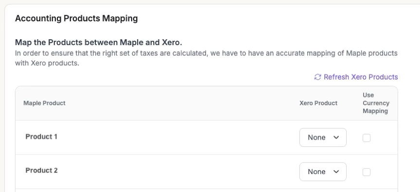 Select the corresponding Xero product for each Maple product and update the mapping. Check off Use Currency Mapping if you would like to map to specific currencies. Otherwise, all currencies will map to a single Xero product.