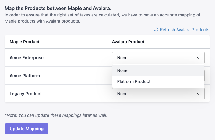 Tax Products Mapping: To provide the correct tax code when we submit transactions to Avalara, we allow mapping of Maple products to AvaTax products. Note: You can change these mappings at a later time as well.
