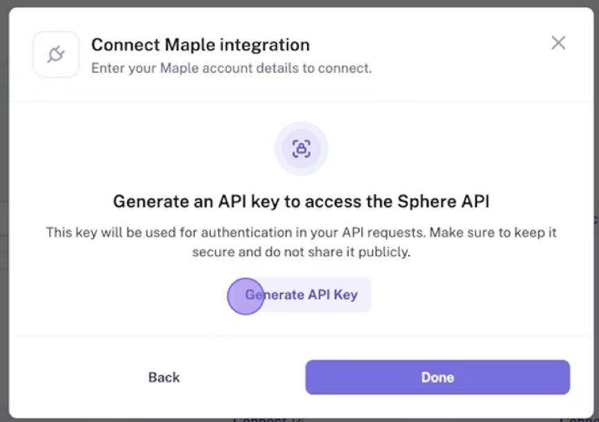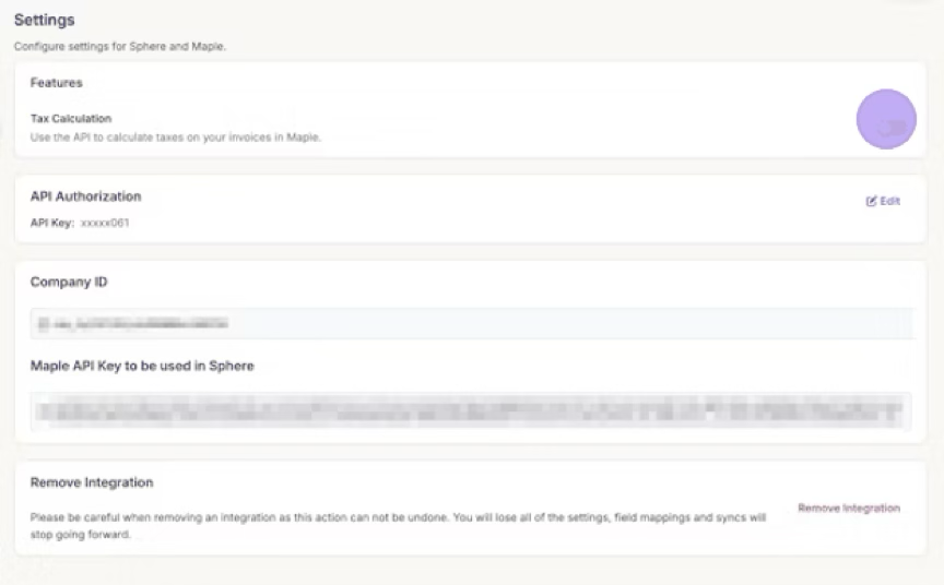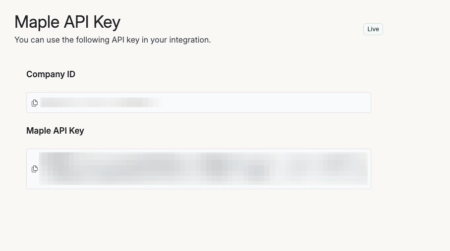 You will be provided with a Company ID and Maple API Key. Keep this tab open. You will need to enter it in Sphere.