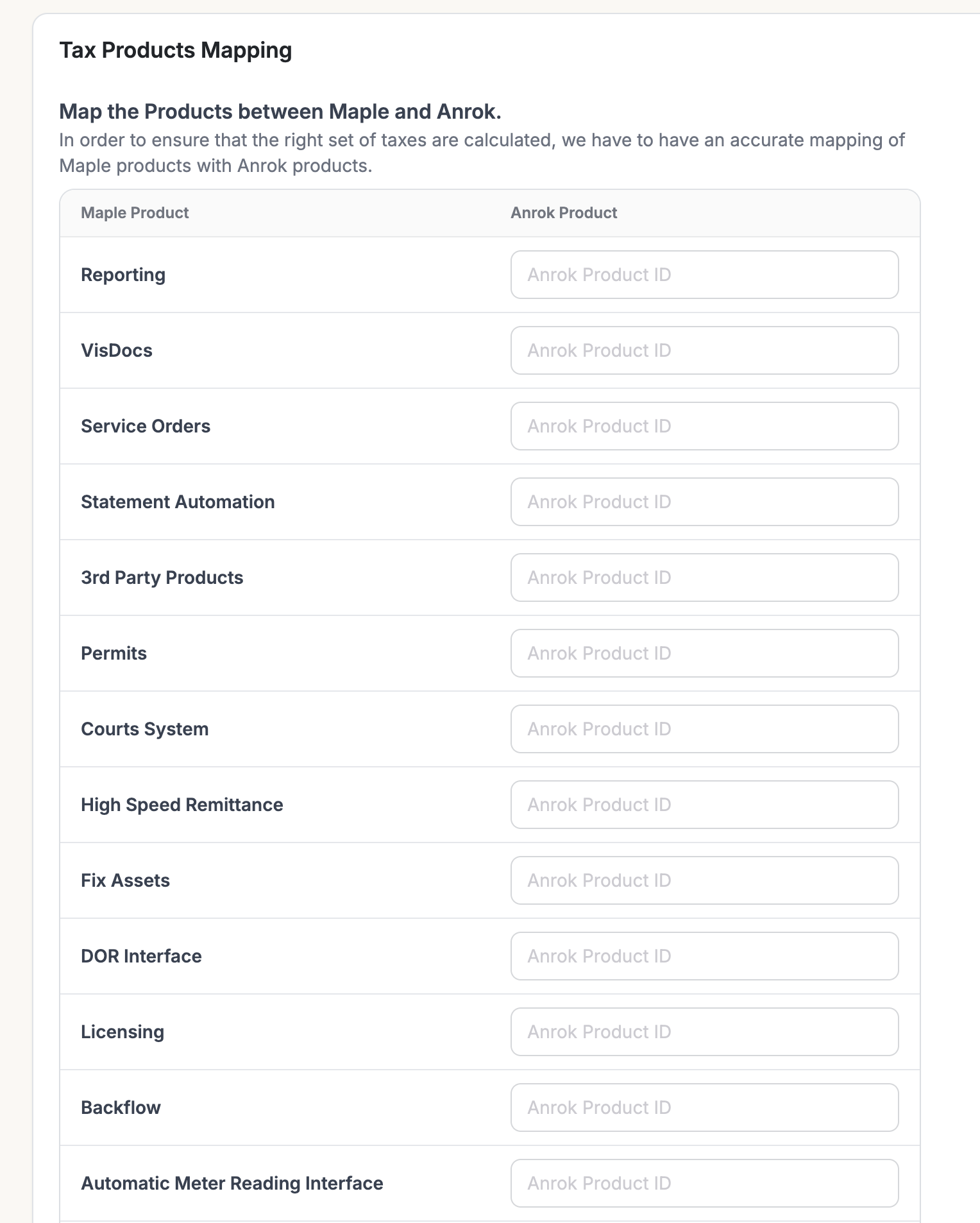 In order to provide the correct tax code when we submit transactions to Anrok, we allow mapping of Maple products to Anrok products. Note: You can change these mappings at a later time as well.