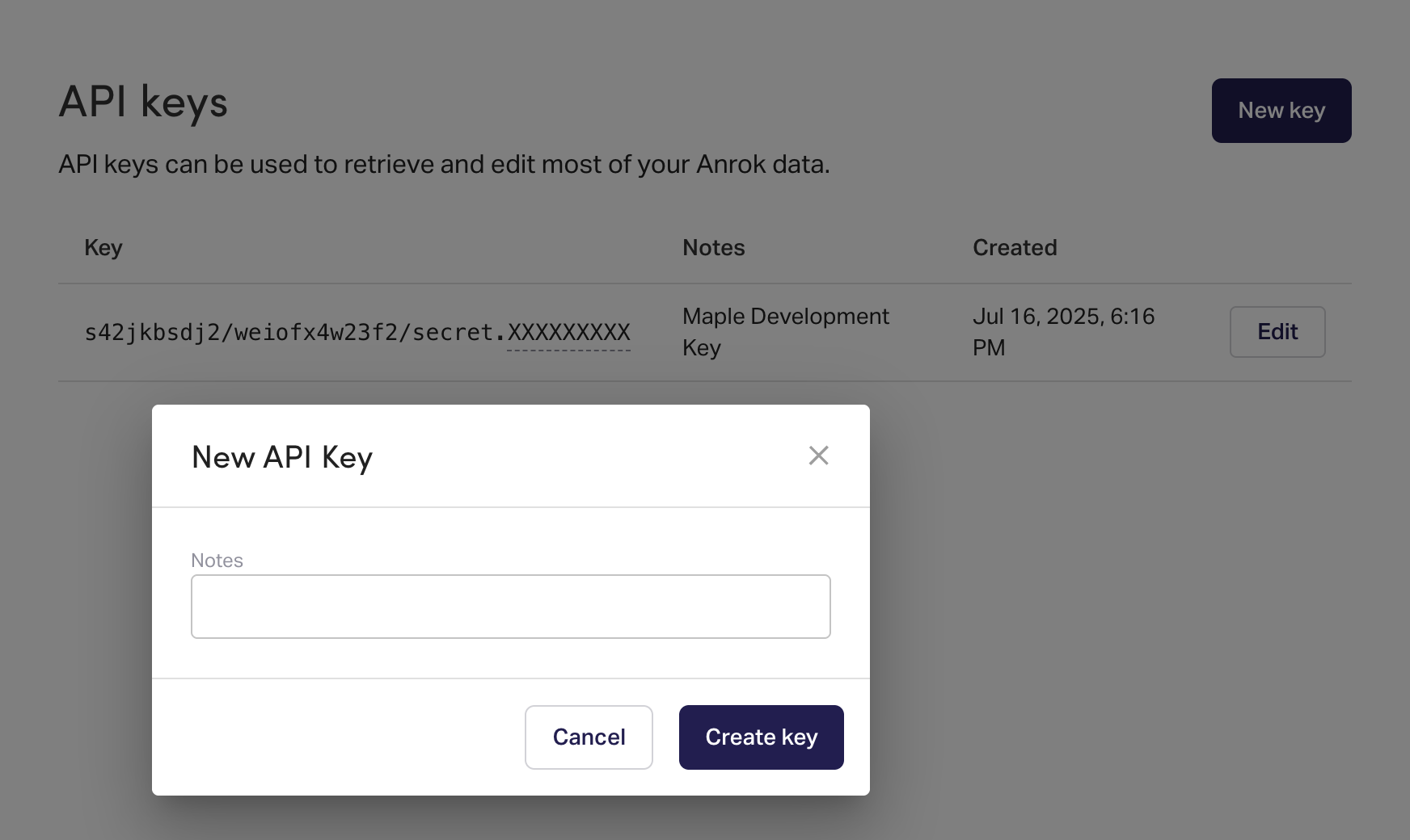 Paste Anrokās API Key copied from the previous step into Maple. Click Update