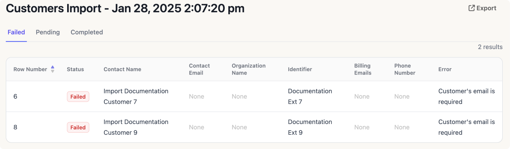 If some rows have failed, review the reason for the failure under the “Error” column.