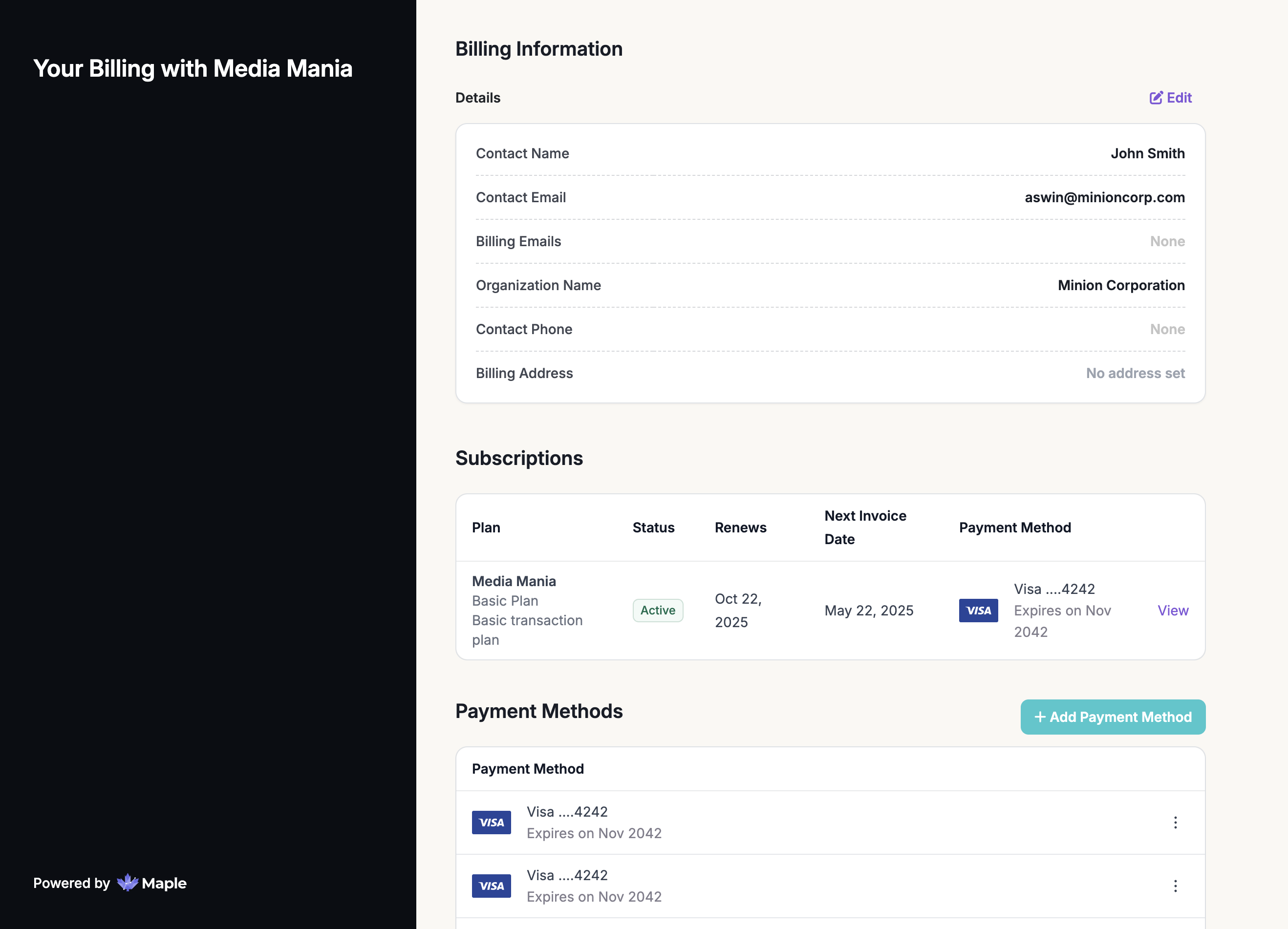 Maple provides a hosted self-service interface that allows your customers to securely manage their billing-related information, such as invoices, payments, payment methods, and subscription details (eg usage).
