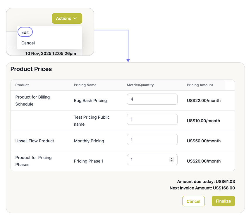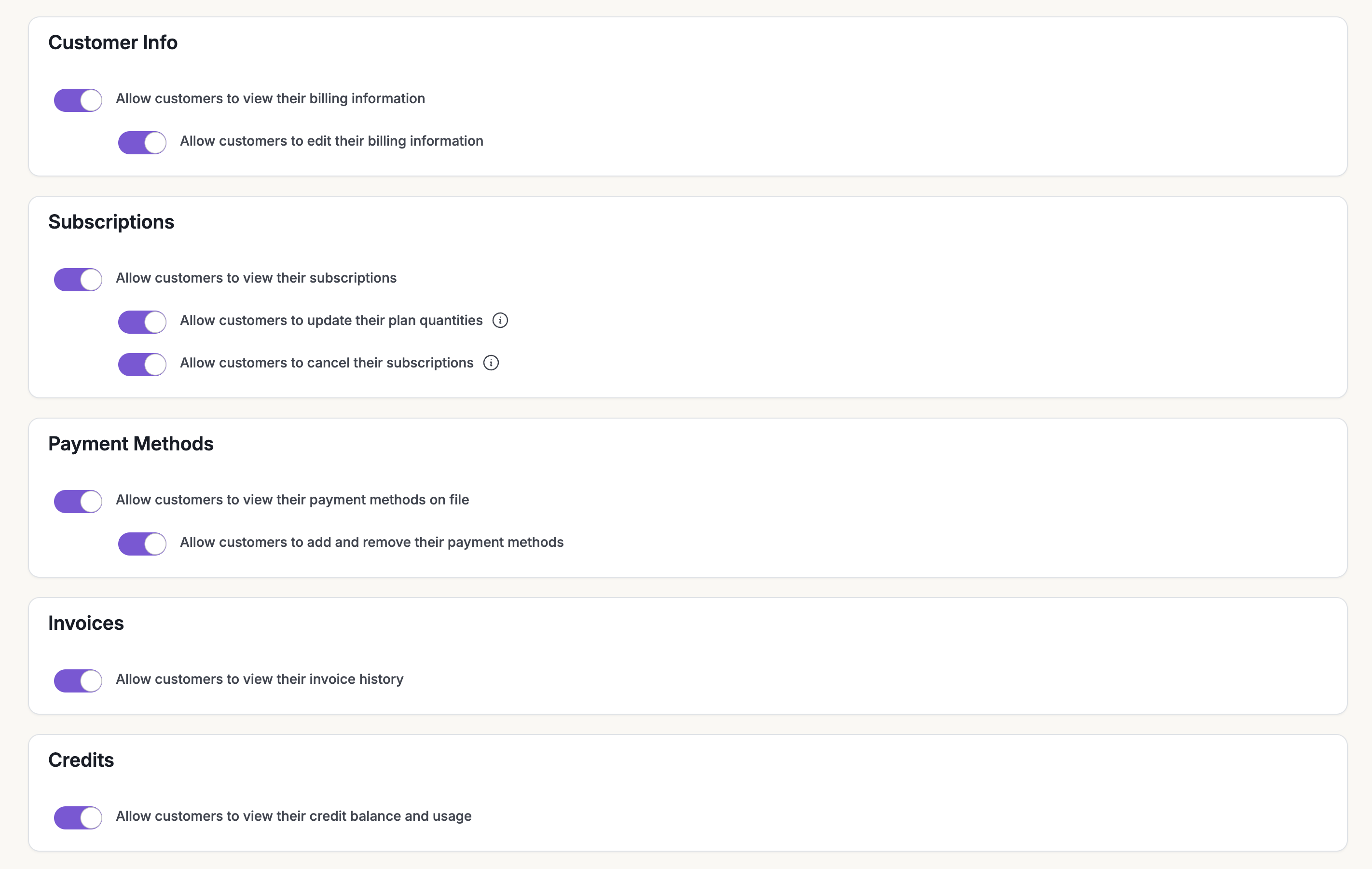 Enable Allow customers to update their plan quantities to allow customers to self-manage their subscription quantities, such as increasing or decreasing seat or license counts.