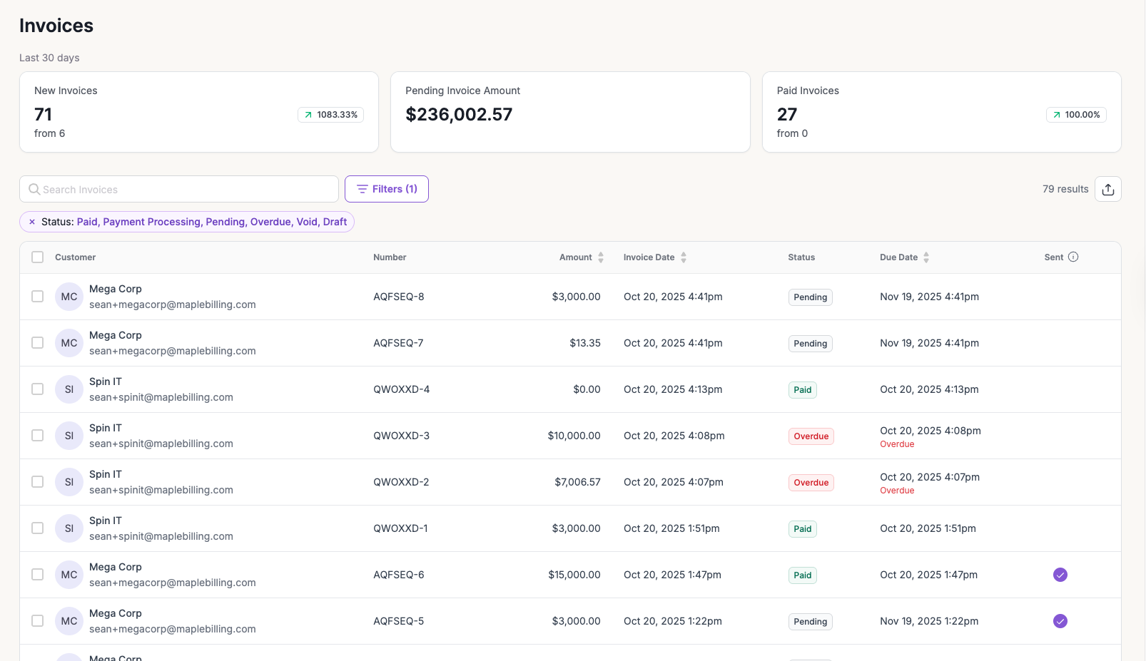 Maple automates the invoice creation and payment tracking process for recurring subscription or one-time charges. Invoices typically include the product or service purchased, the price, any applicable taxes or fees, and payment terms. Invoices are used to track sales, ensure payment, and provide documentation for accounting purposes.