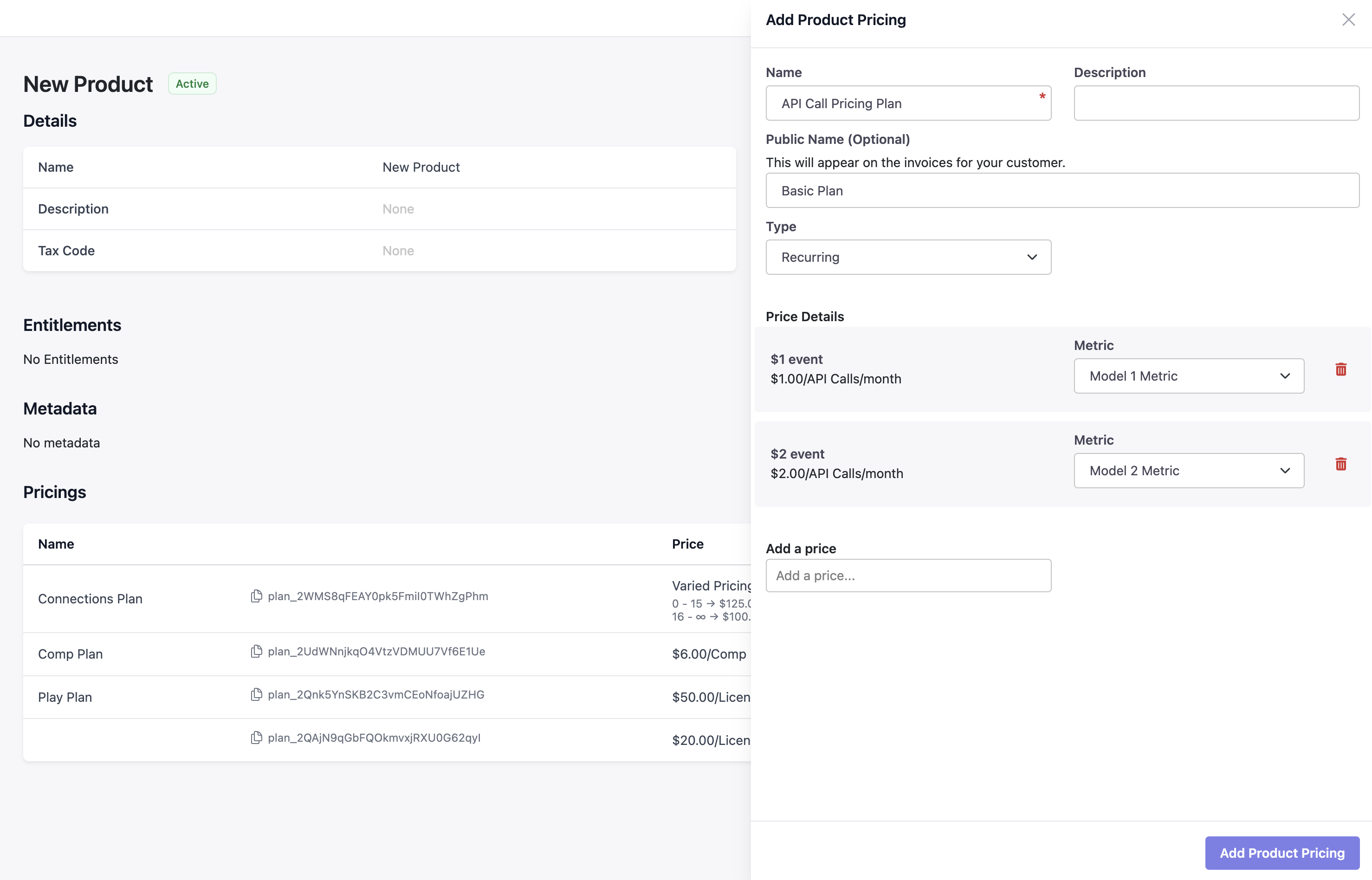 One or more metrics can then be added to a single product pricing as separately priced components. This allows you to offer plans that contain components of different billing types.