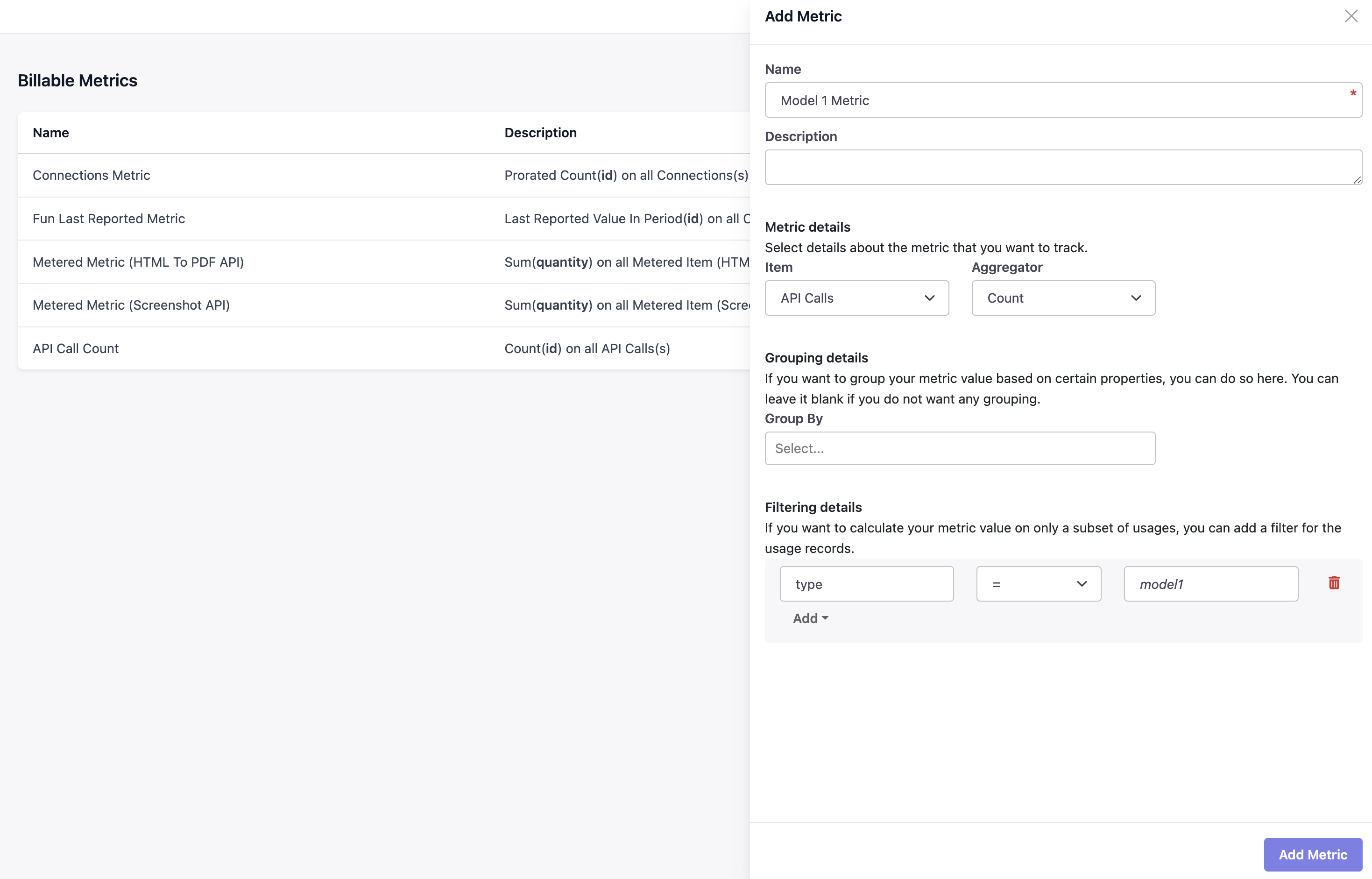 Billable metrics are composed of filters and aggregation clauses. Think of these as WHERE and GROUP BY SQL clauses, respectively. For example, you can create a billable metric for the COUNT() of API calls based on the following usage-based event