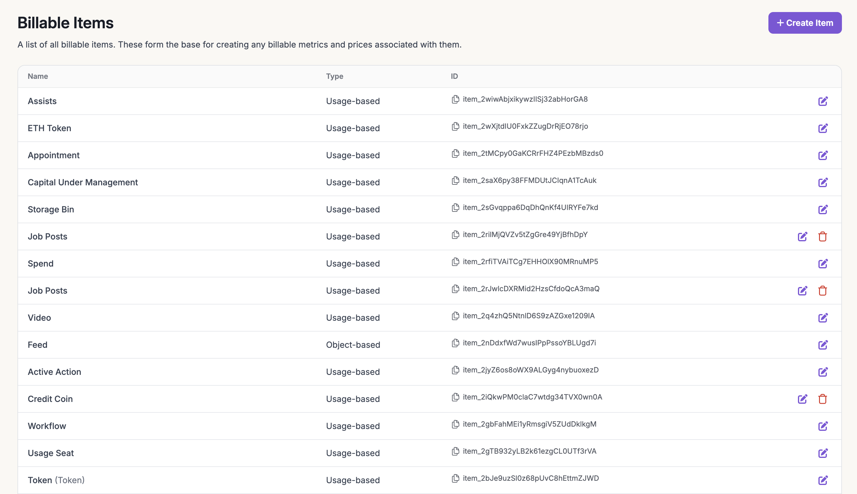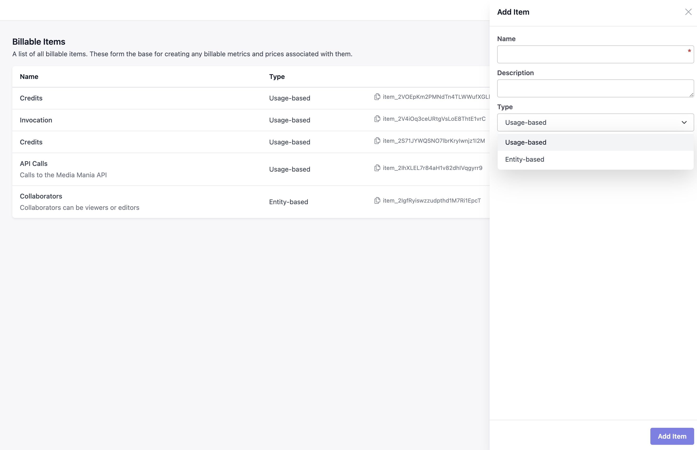Billable items are the core unit for charging a customer through Maple. This typically is a standard license, a usage-based item such as API calls or an object such as user seats. Billable items can be set up through the Maple web application. Maple provisions “License” items by default. For usage-based and object-based items, a billable metric needs to be defined before setting up pricing.