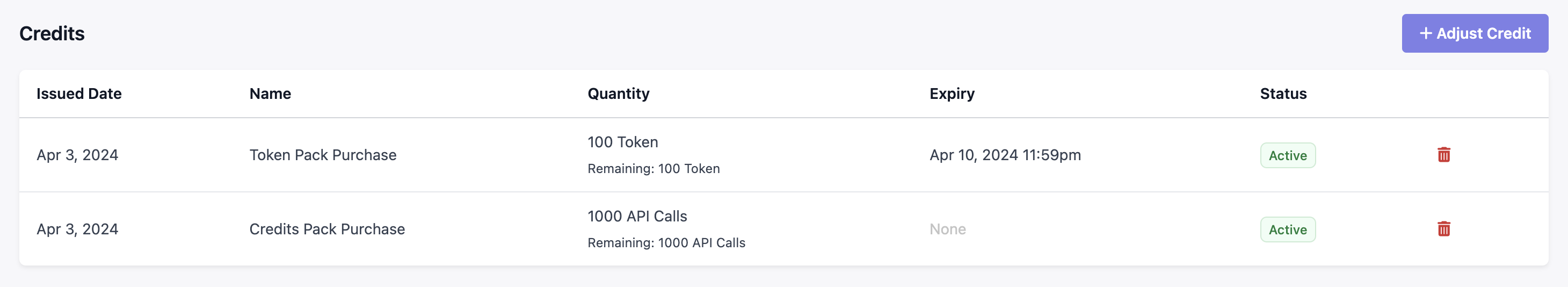 Credits for a customer can be managed through the Maple web application or through the Credits API. Credits related to different billable items can be added, expired or revoked on an individual grant basis.