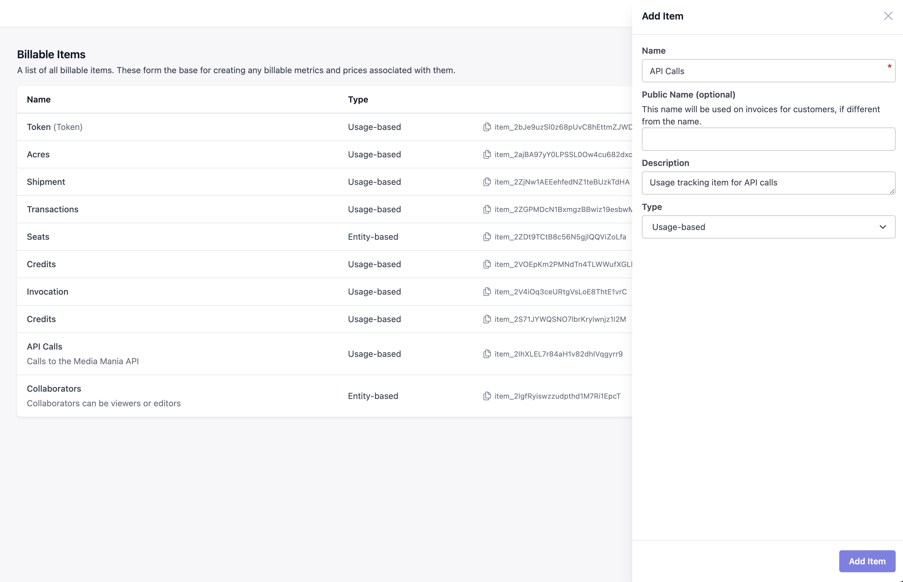 Billable items in Maple help track distinct entities for which you would like to track credits in your application. For example, this could be “API Calls”