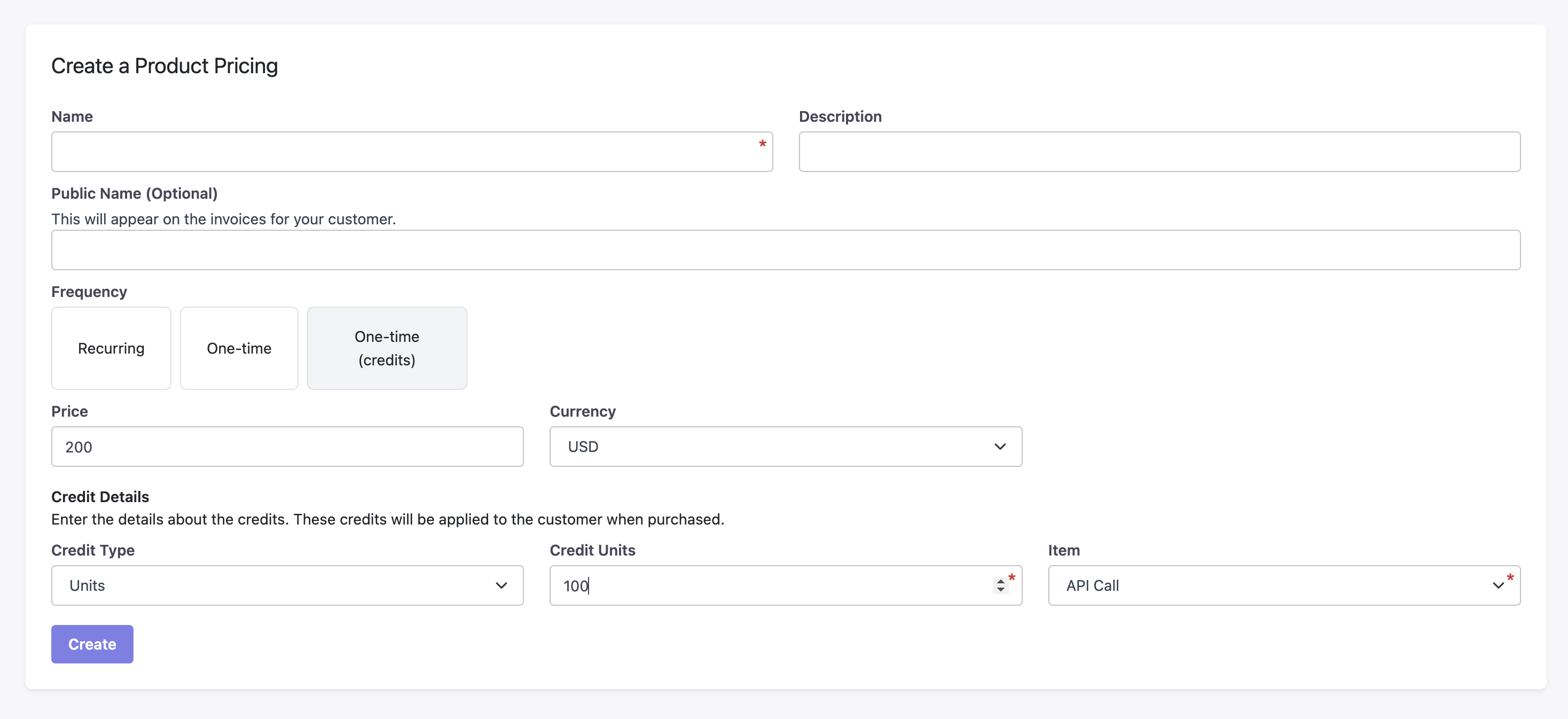 Maple supports the creation of pricing plans that add credits for different billable items for the customer. To get started with creating credits-based pricing, go to Products > Add New Product Pricing.