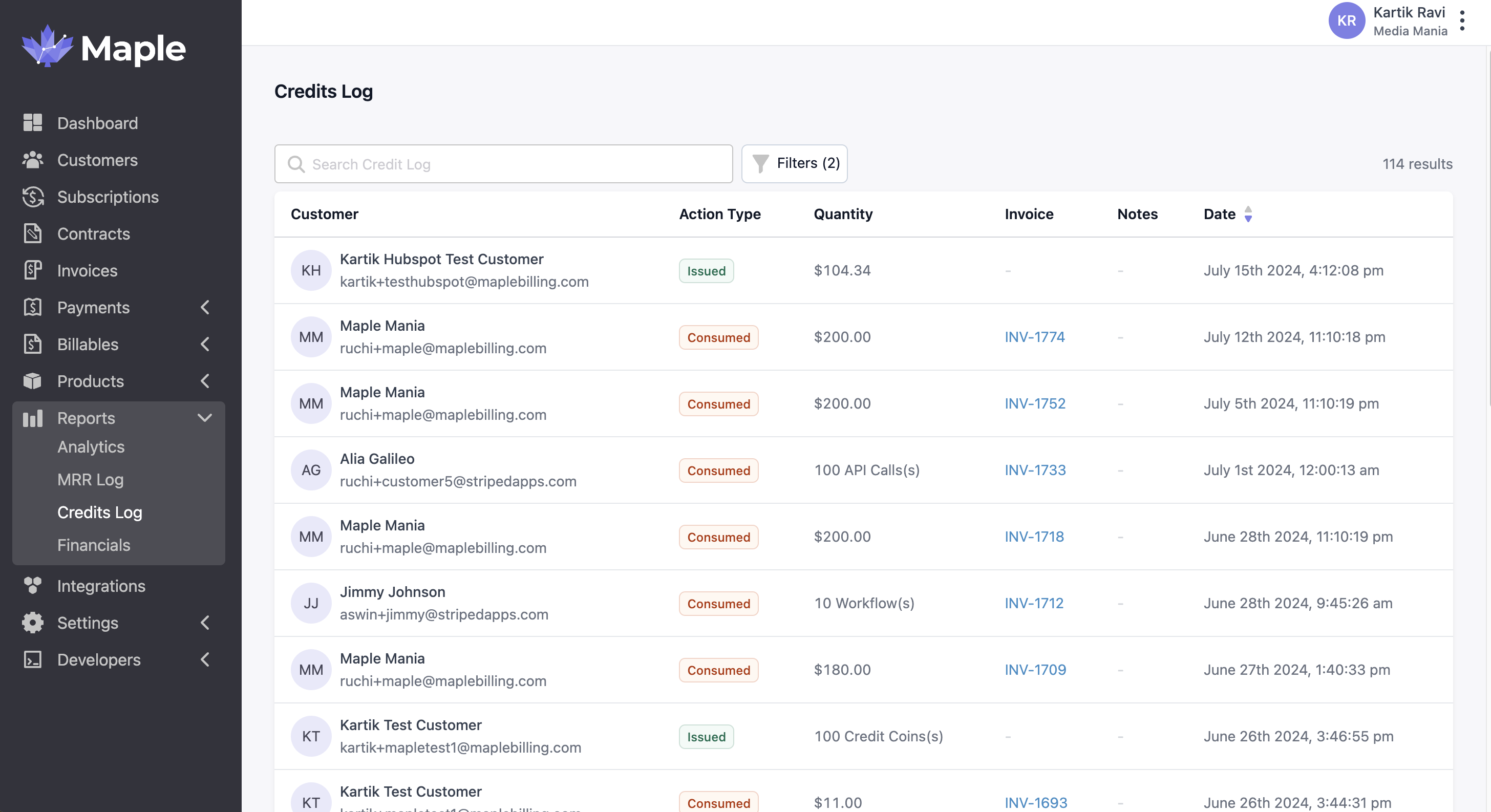 An auditable log of all credits can be viewed through the Maple web application (Reports > Credit Log) or through the API