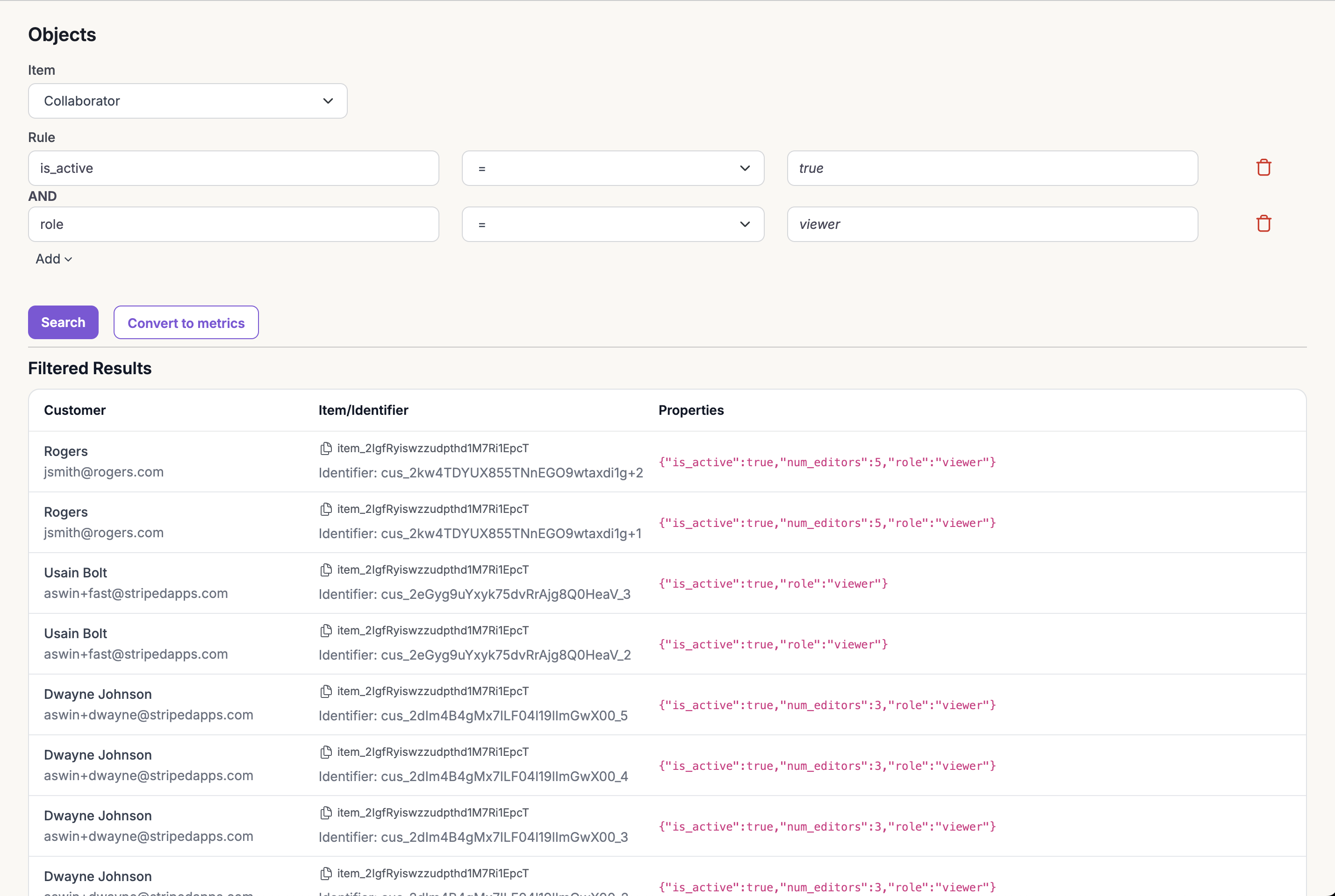 Example: A company selling a home monitoring system can set up generic objects like “Devices” or more specific objects like “Camera”, “Motion Detector”, etc and charge customers based on the number of objects - Beginner Plan with 5 Devices OR 3 Cameras and 2 Motion Detectors
