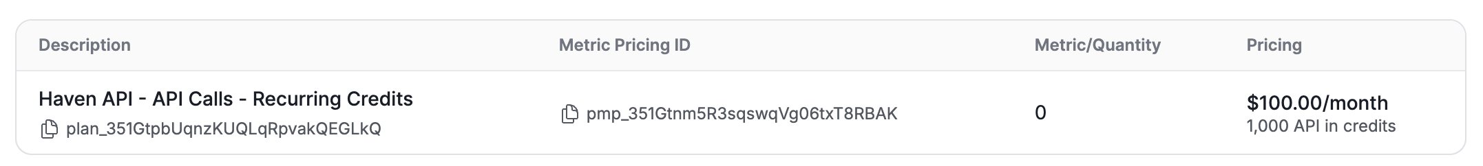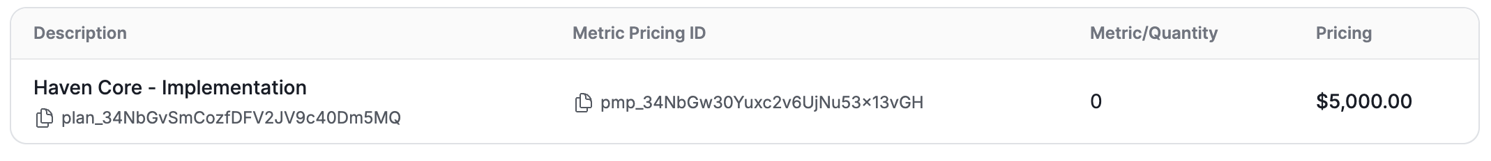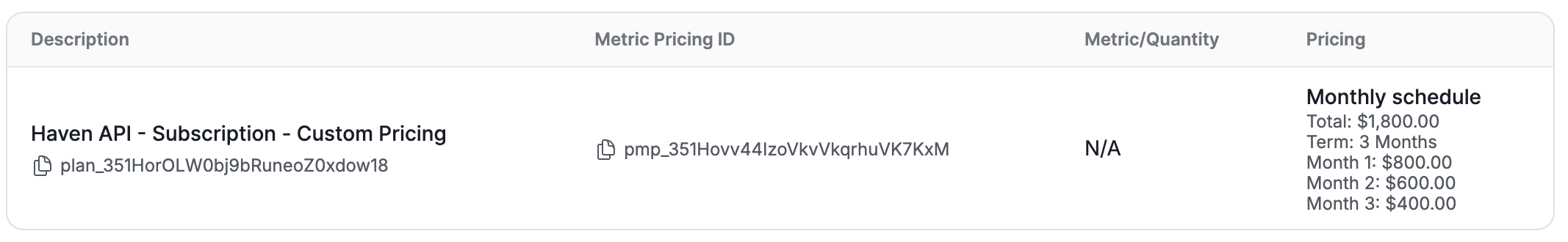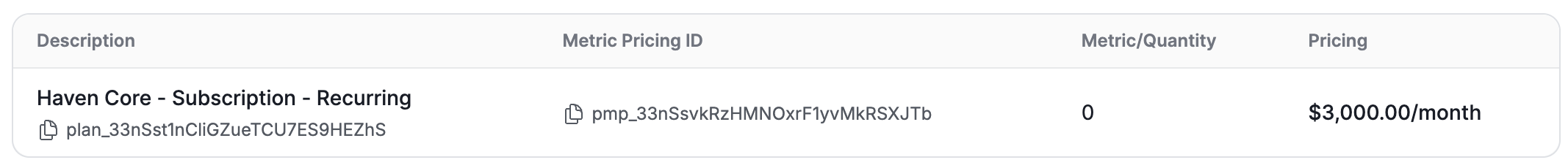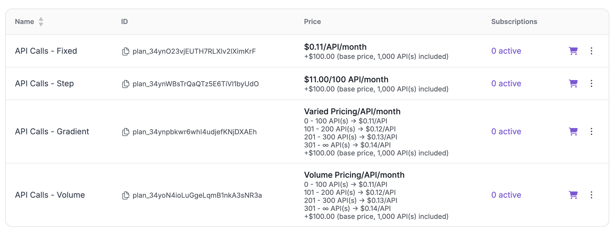 The product pricing can also be composed of multiple billable items and metrics tagged with an item price. Adding new prices is typically useful for creating custom plans for specific customers.