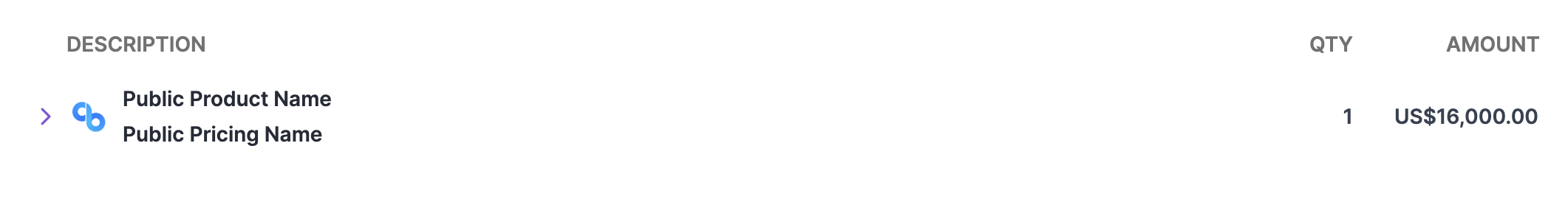 Example Invoice with the Public Product Name and Public Pricing Name showcasing as a line-item: