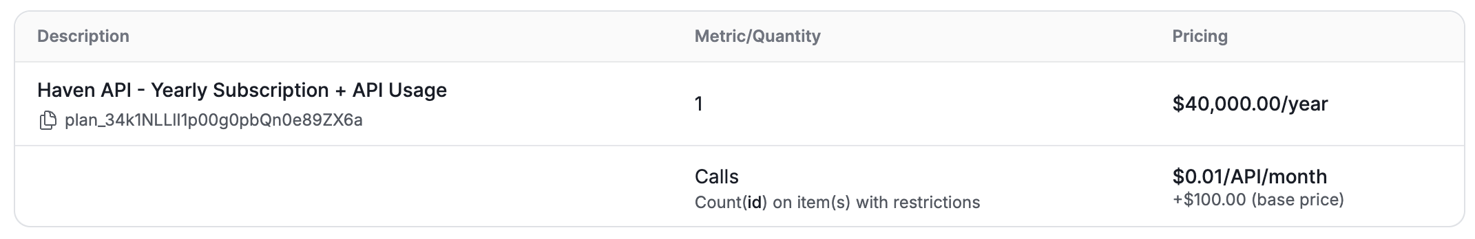 Example: A Multi-item plan with a $40,000/year subscription, plus usage-based pricing of $0.01 per API call per month, with a $100 monthly minimum usage charge.