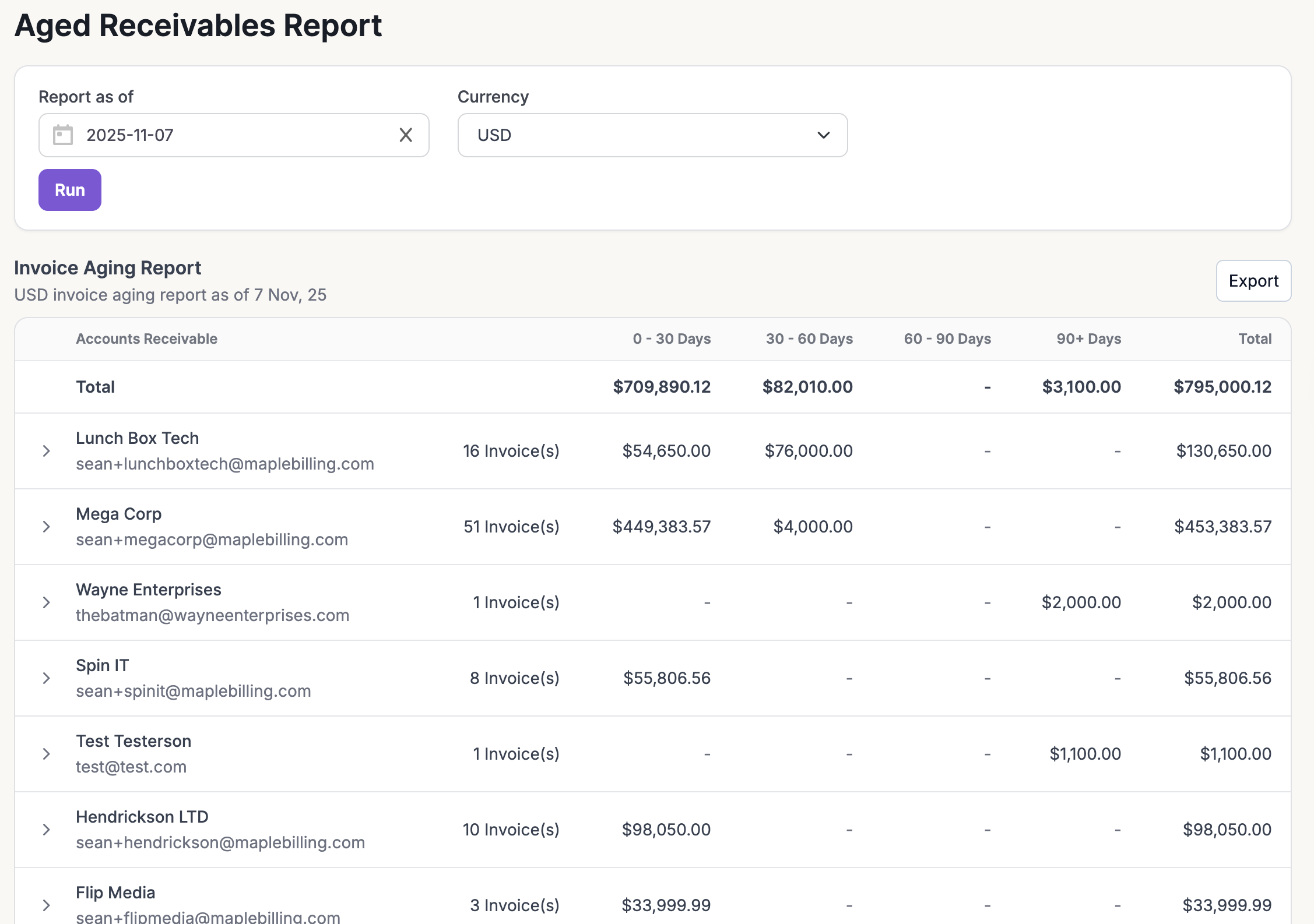 Since Maple serves as the source of truth for pricing, subscriptions, one-time charges and invoicing, along with payment status, Maple can provide detailed reporting that allows finance teams to have a comprehensive overview of financial performance and position.