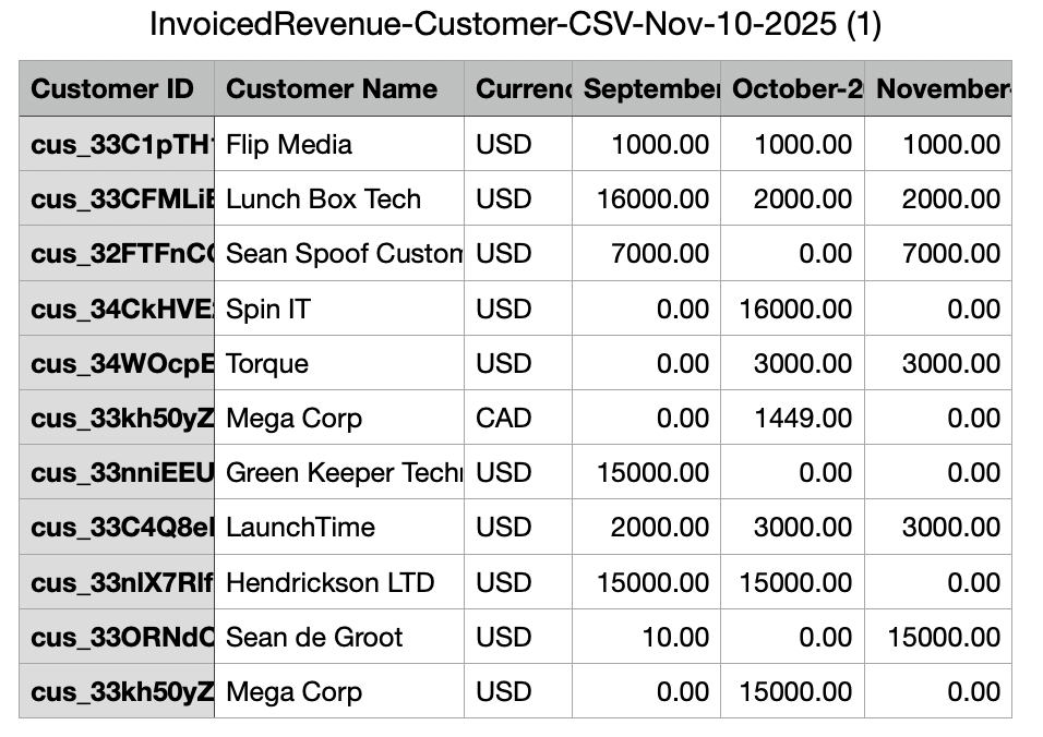 Receive a breakdown of invoiced revenue per customer. This is guaranteed revenue and captures all invoice amounts, both recurring and one-time, across different time periods and currencies. It helps you see where real cash is being generated, how customer billing patterns change, and how total revenue compares beyond just subscriptions.
