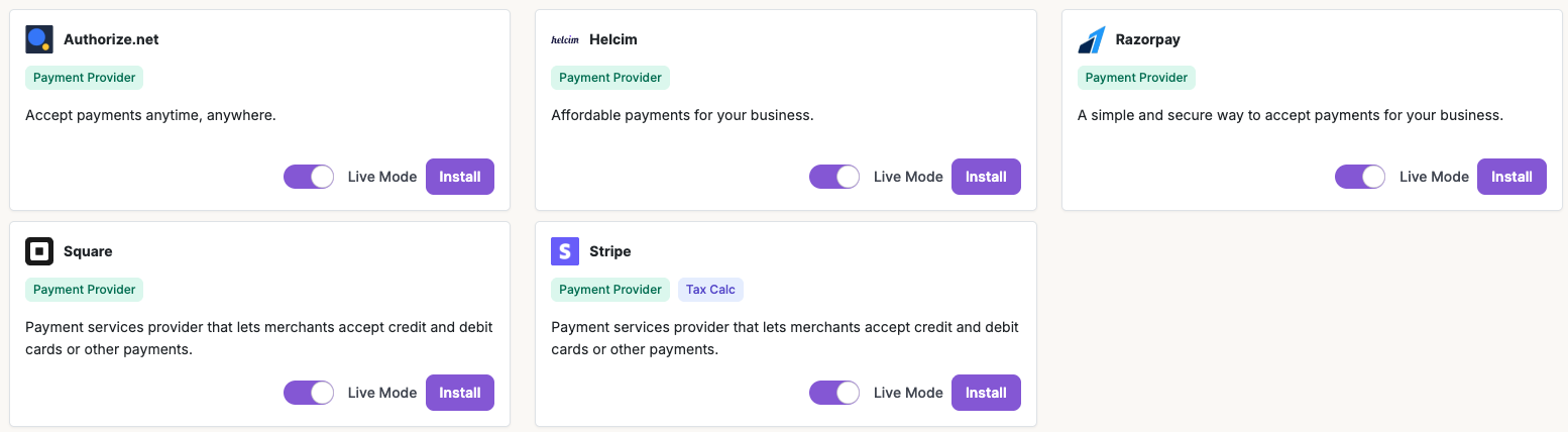 Integrate one of our five payment providers by navigating to Integrations > Install > Connect Account > Configure.