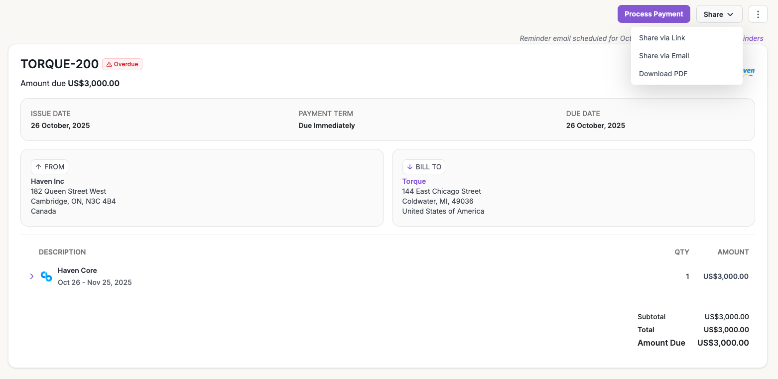 In manual invoicing mode, you’ll see the invoice as follows. You can then share the invoice with your customer for payment.