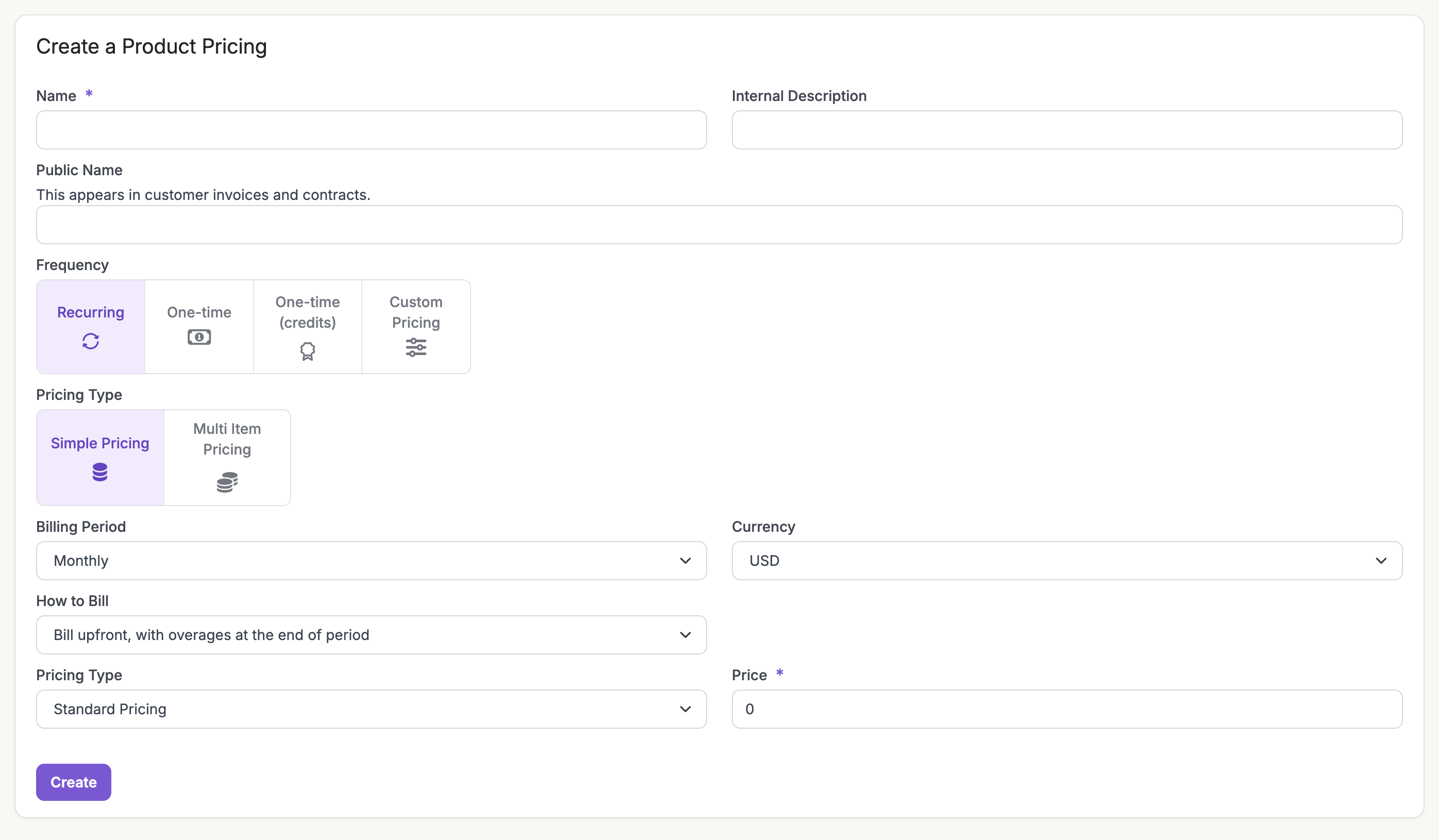 You cannot create product pricing using the API. This is to ensure proper setup and thought around the different components of your pricing plan and strategy.