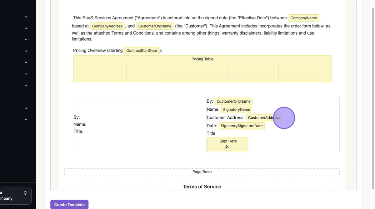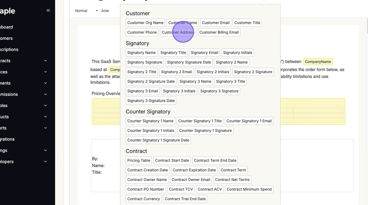 We will include the "Customer Address" variable in our contract by clicking on the document where we would like it placed and then selecting the desired variable.