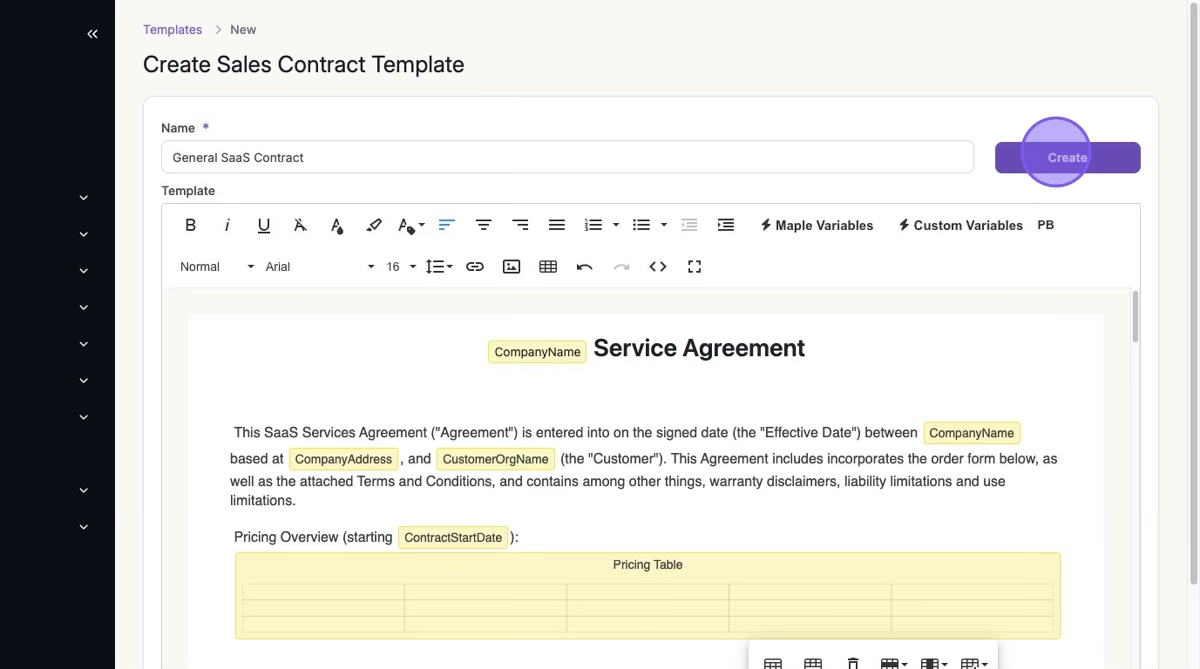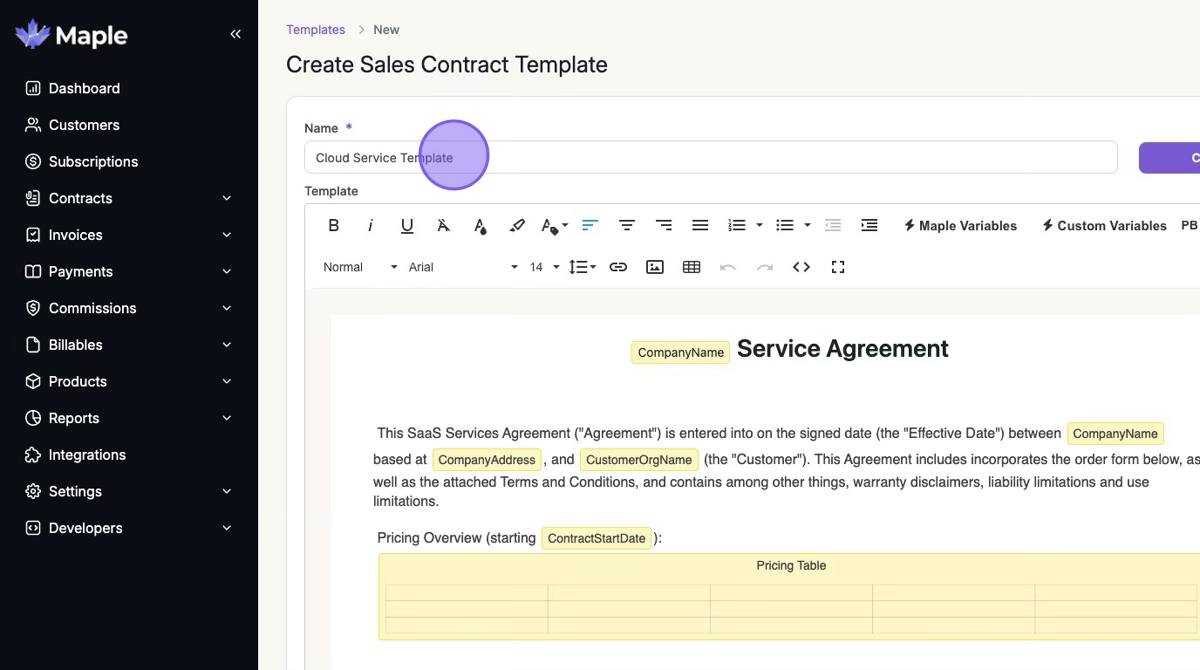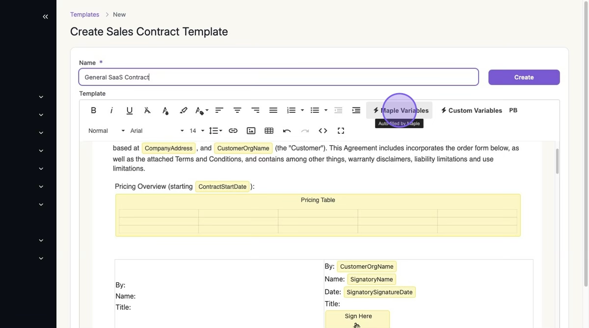 Maple variables are used to insert variables that will populate from the contract, such as customer information and your company's information.