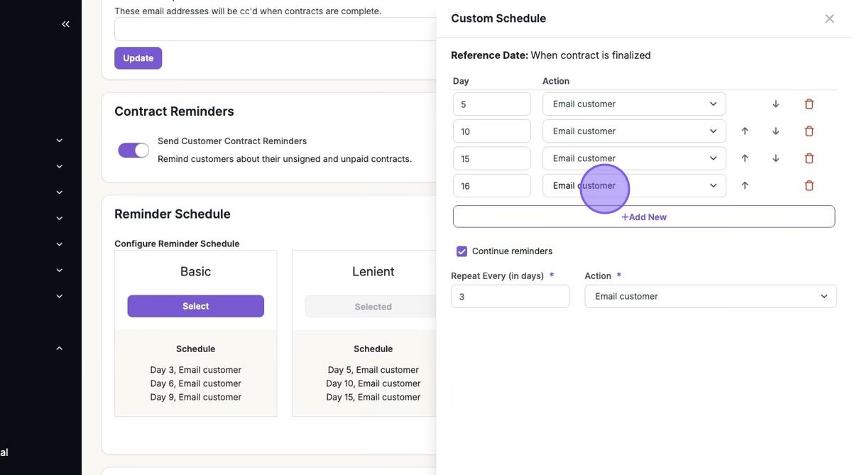 To maintain a consistent schedule, click "Continue reminders" to automatically repeat the emails every X days following the last action set above.