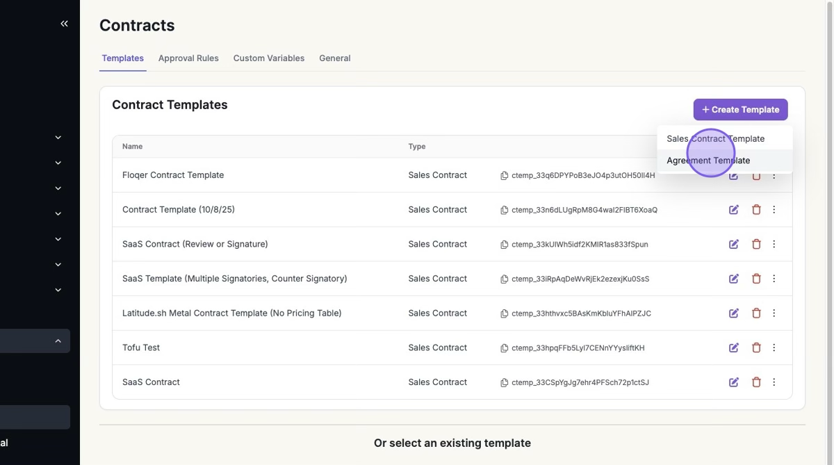 1. Click Settings > Contracts > "+ Create Template" > Agreement Template