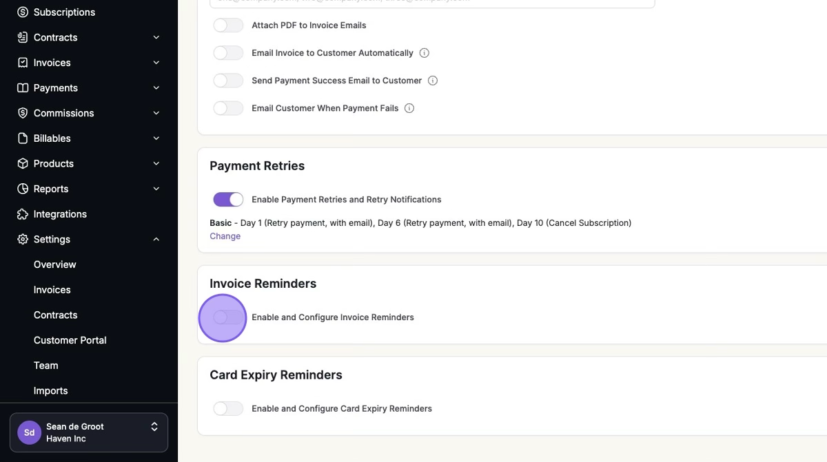 2. Turn "Enable and Configure Invoice Reminders" On