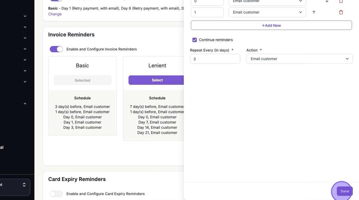 Set up and configure invoice reminders to notify your customers about upcoming or missed payments.