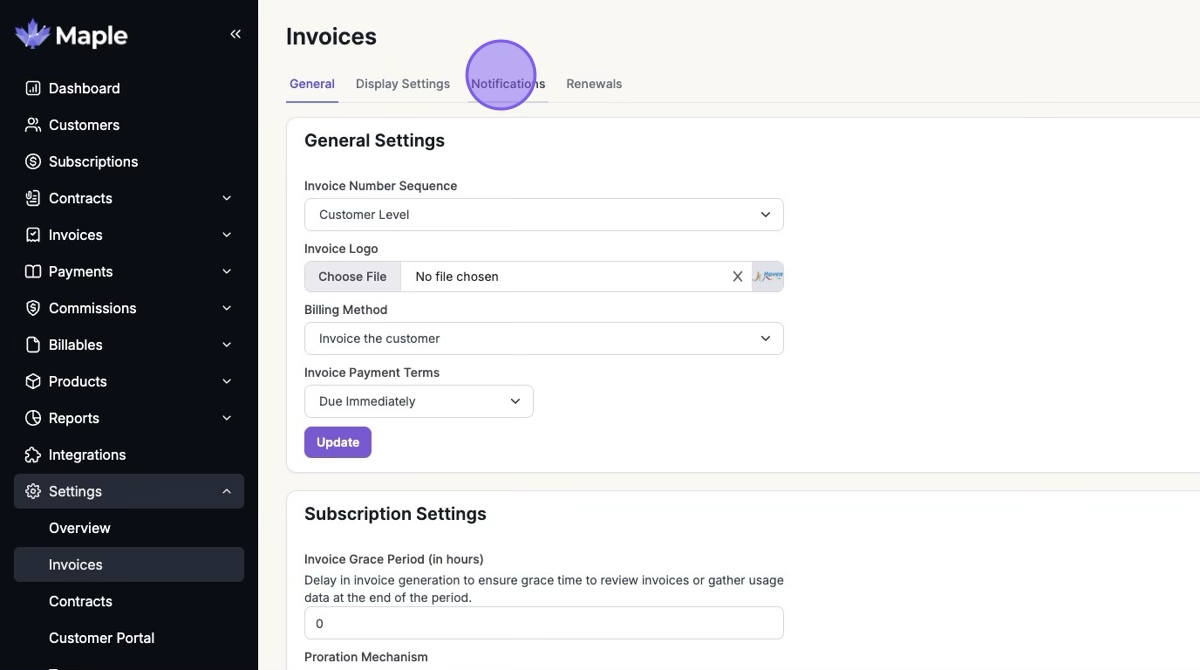 1. Click Settings > Invoices > "Notifications"