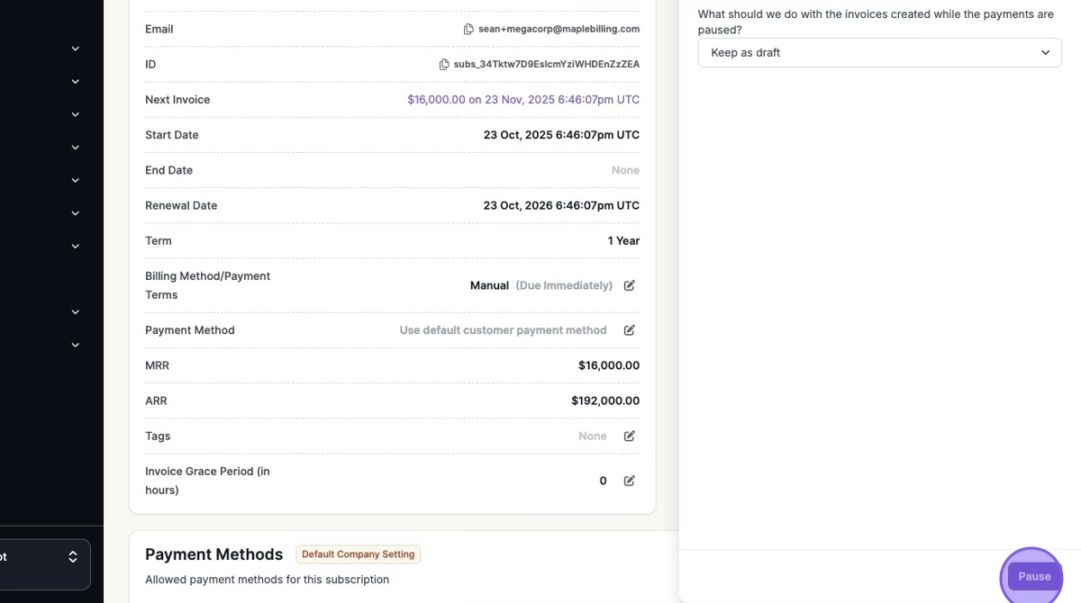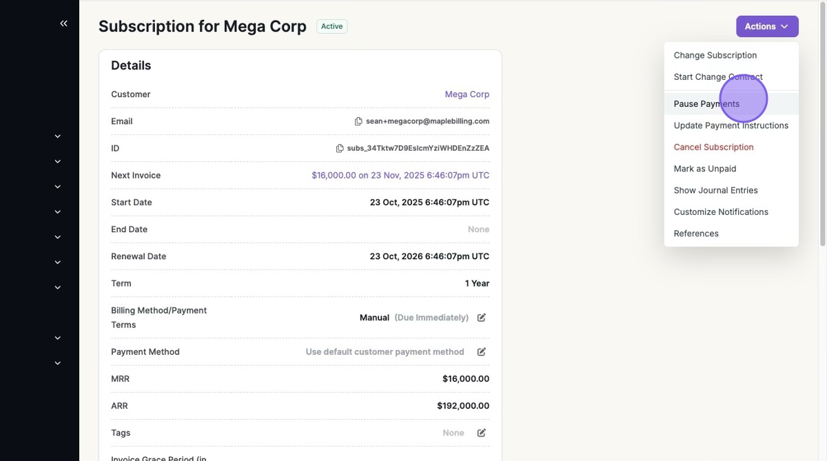 Pause a subscription to temporarily stop billing and service, allowing you to defer payments until the subscription resumes.
