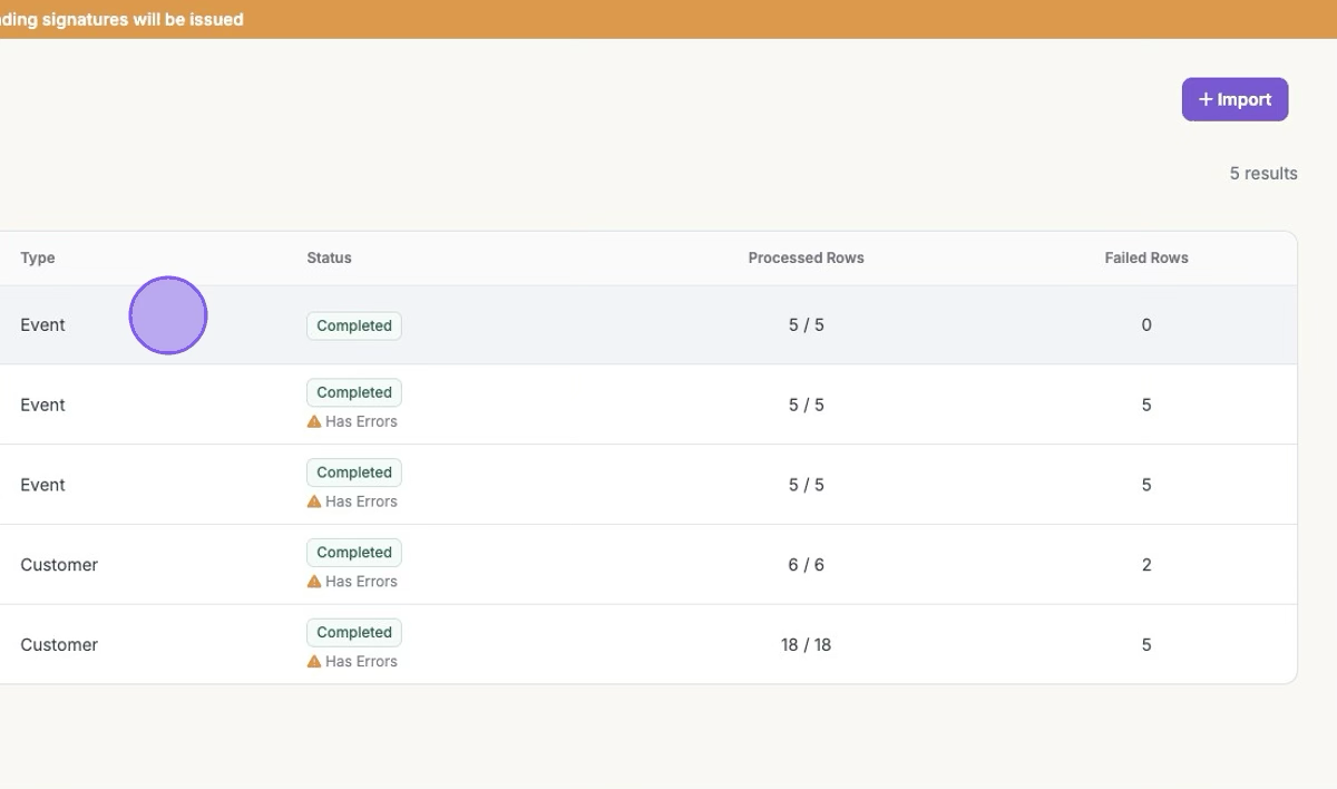 Errors in the import file can be reviewed in the import details. Before re-importing failed rows, remove all successfully imported events from the import file.
