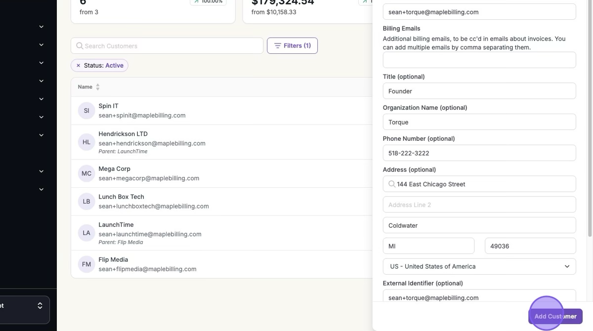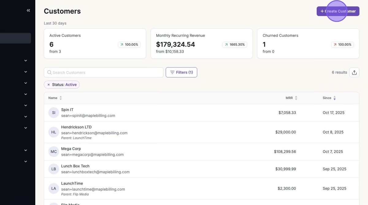 Easily add customers to Maple to manage billing and track your MRR and ARR.