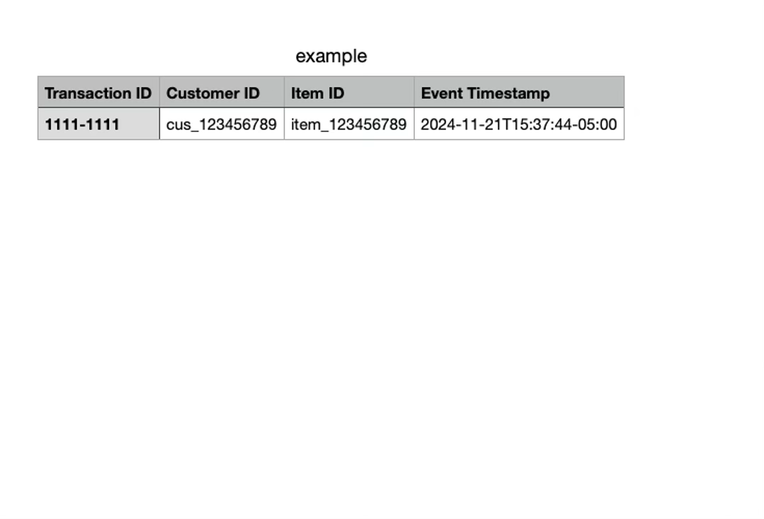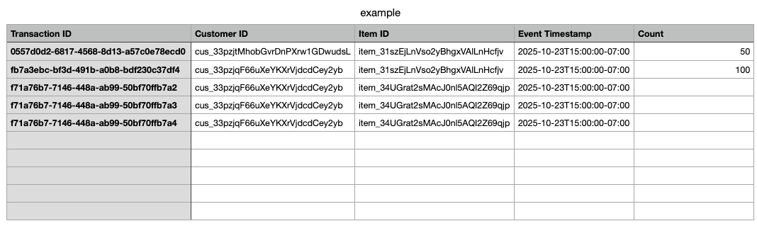 You will see four columns: Transaction ID, Customer ID, Item ID, and Event Timestamp. These are all required fields for import.