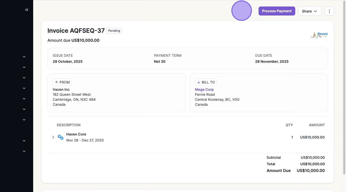 The Invoice is now generated, where you can "Process Payment" if you have payment options on file for the customer or "Share" to be emailed or downloaded and paid.