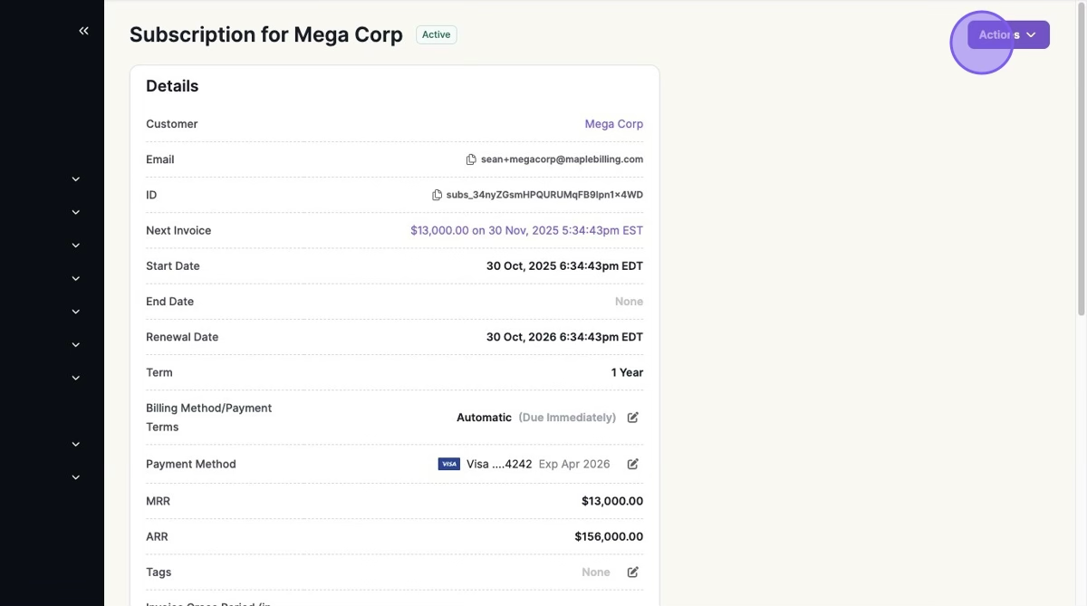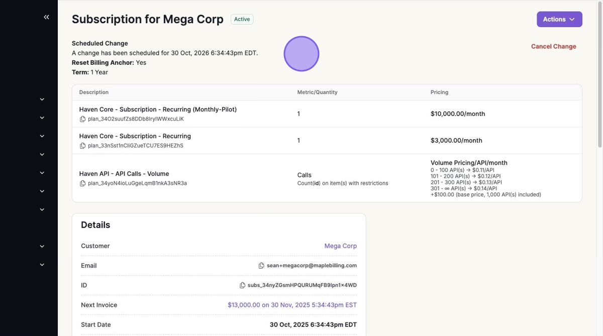 Update a subscription with written consent. A subscription change can include new pricing, set a scheduled start date, reset the billing anchor, and choose how proration is applied.