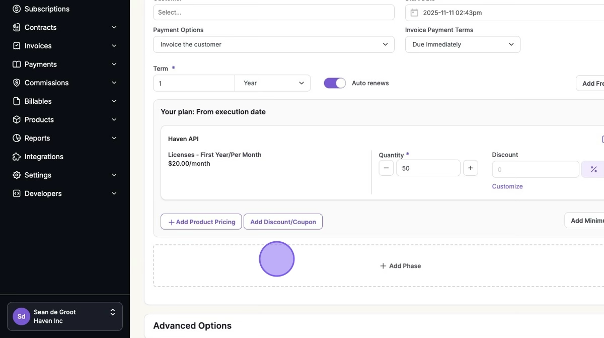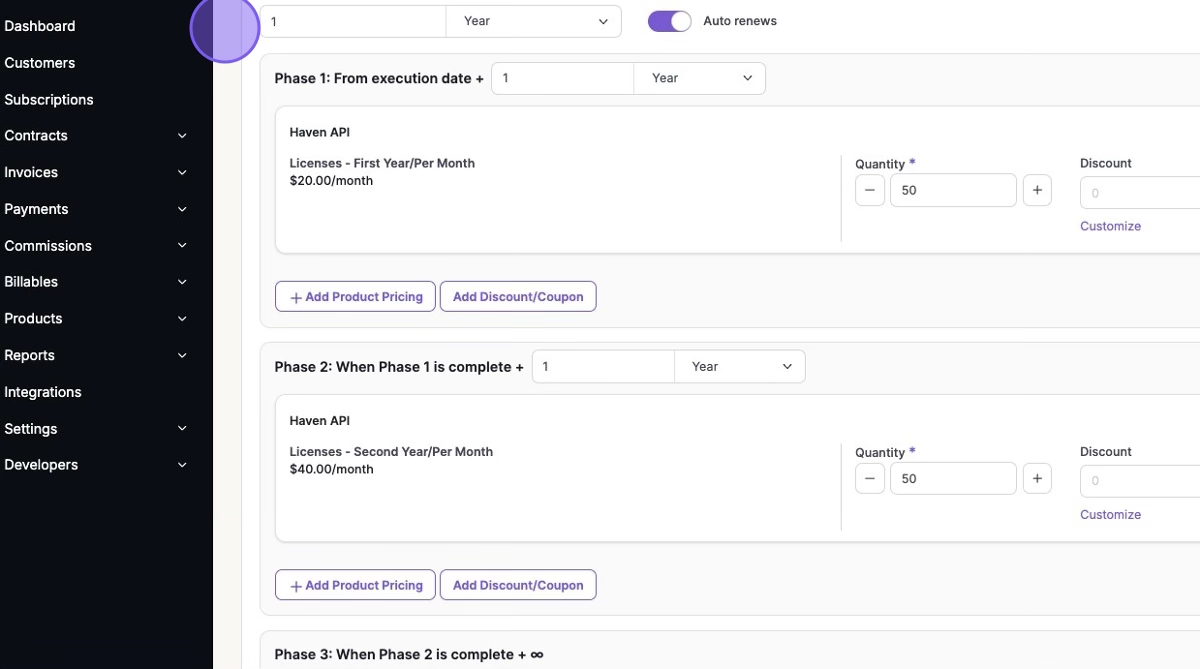 Pricing phases allow you to create contracts and subscriptions with pricing that changes at predefined intervals. This ensures that each phase has a consistent duration, making it ideal for multi-year contracts with phased pricing adjustments.