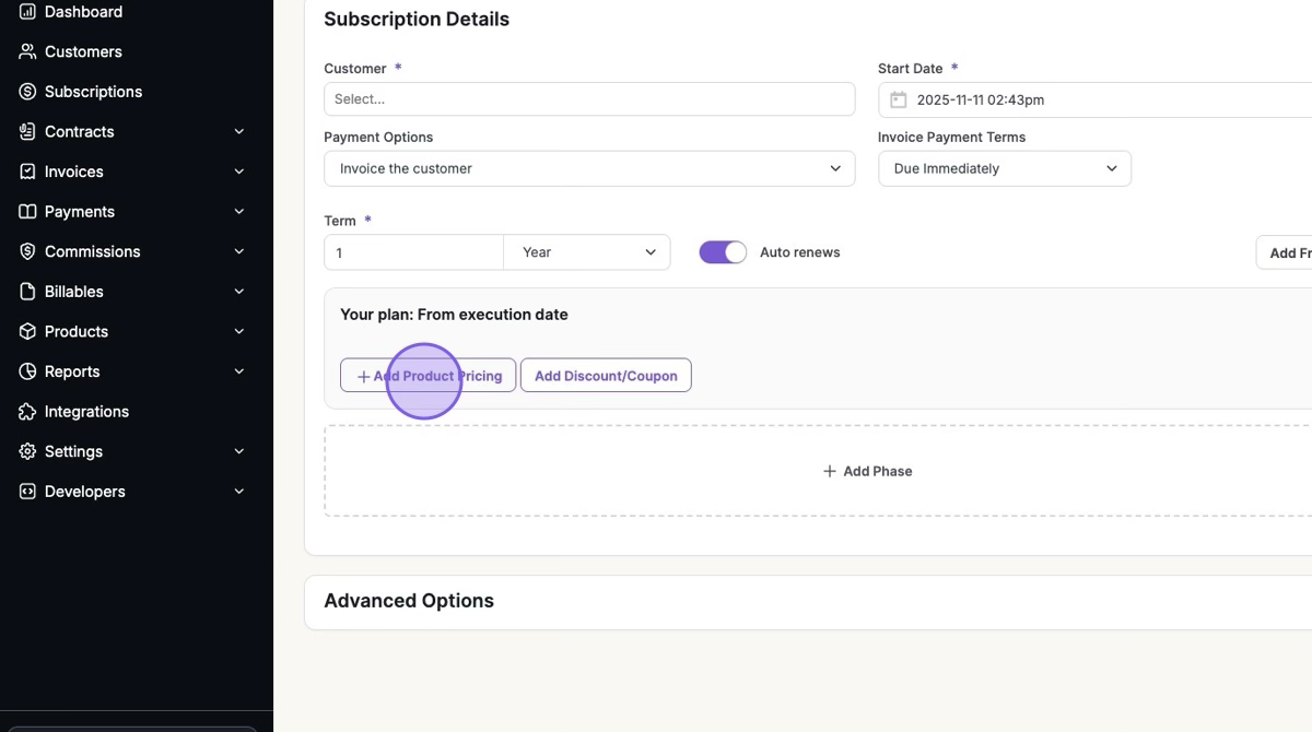 1. On Contract Creation or Subscription Creation > Click "Add Product Pricing"