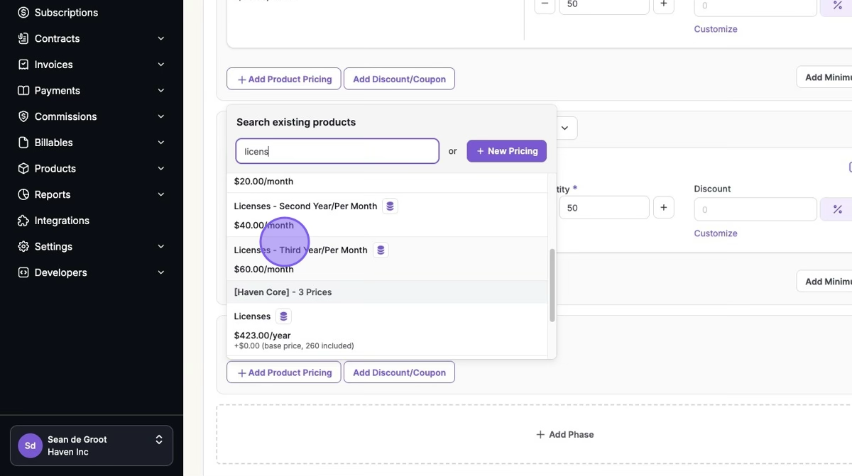 In our example, we will be creating a three-year contract where the price per license changes each year: