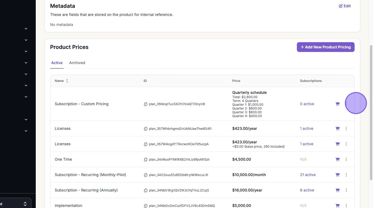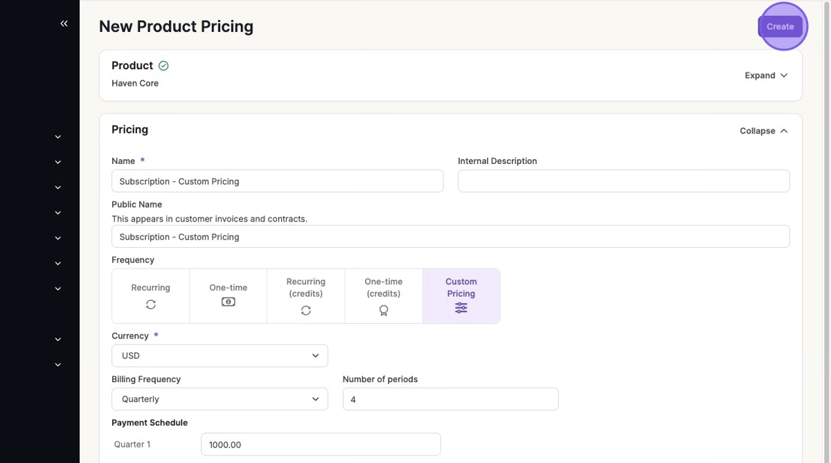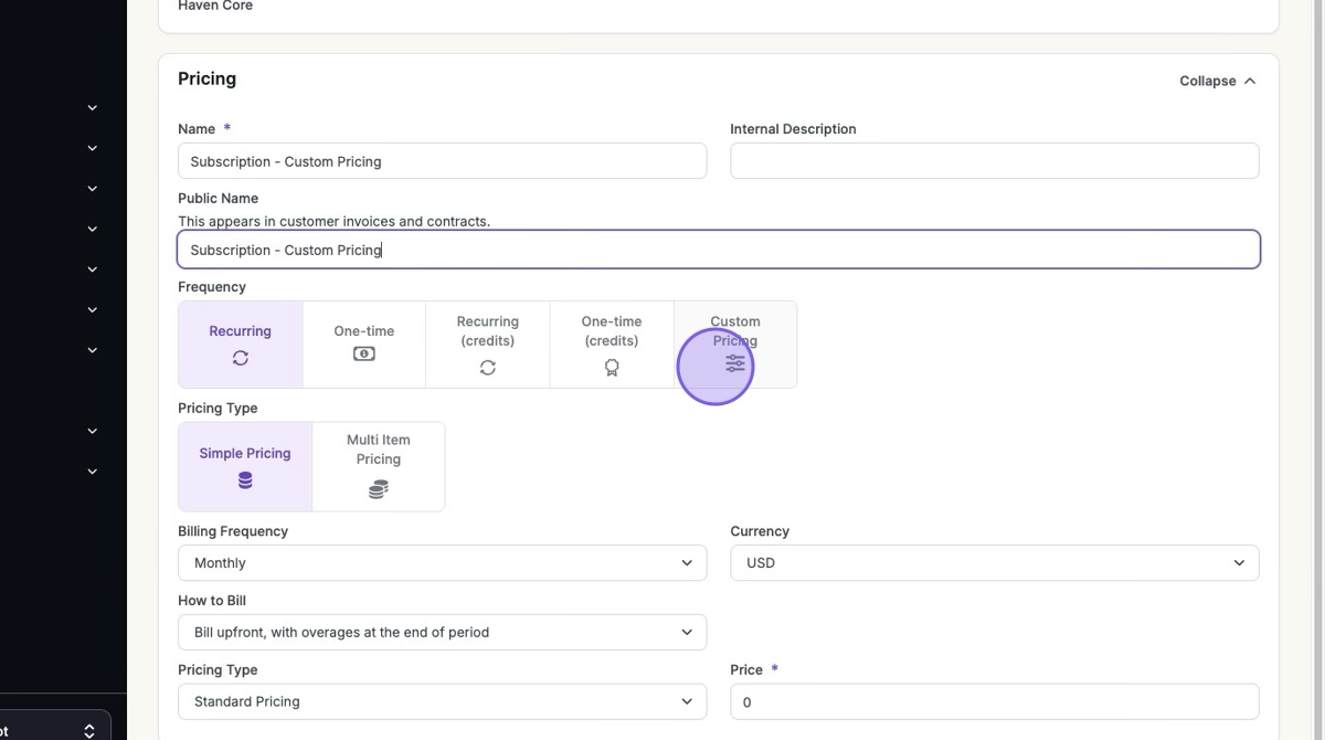 1. Click Products > Overview > Select Product > "+ Add New Product Pricing" > Click "Custom Pricing"