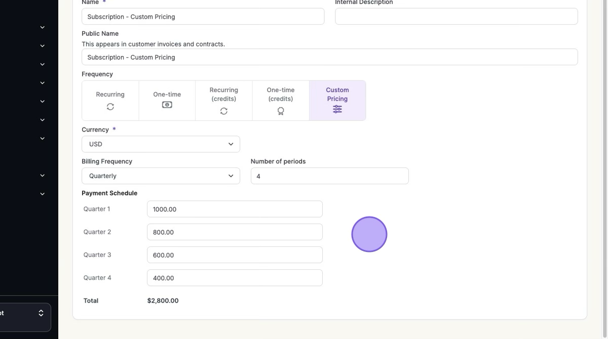 Billing schedules allow you to easily structure contracts with non-regular billing intervals. This is useful when you need to set up non-regular payments over an extended period for a customer, ensuring they’re billed according to specific timelines.
