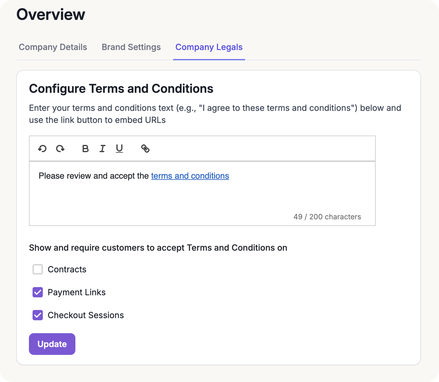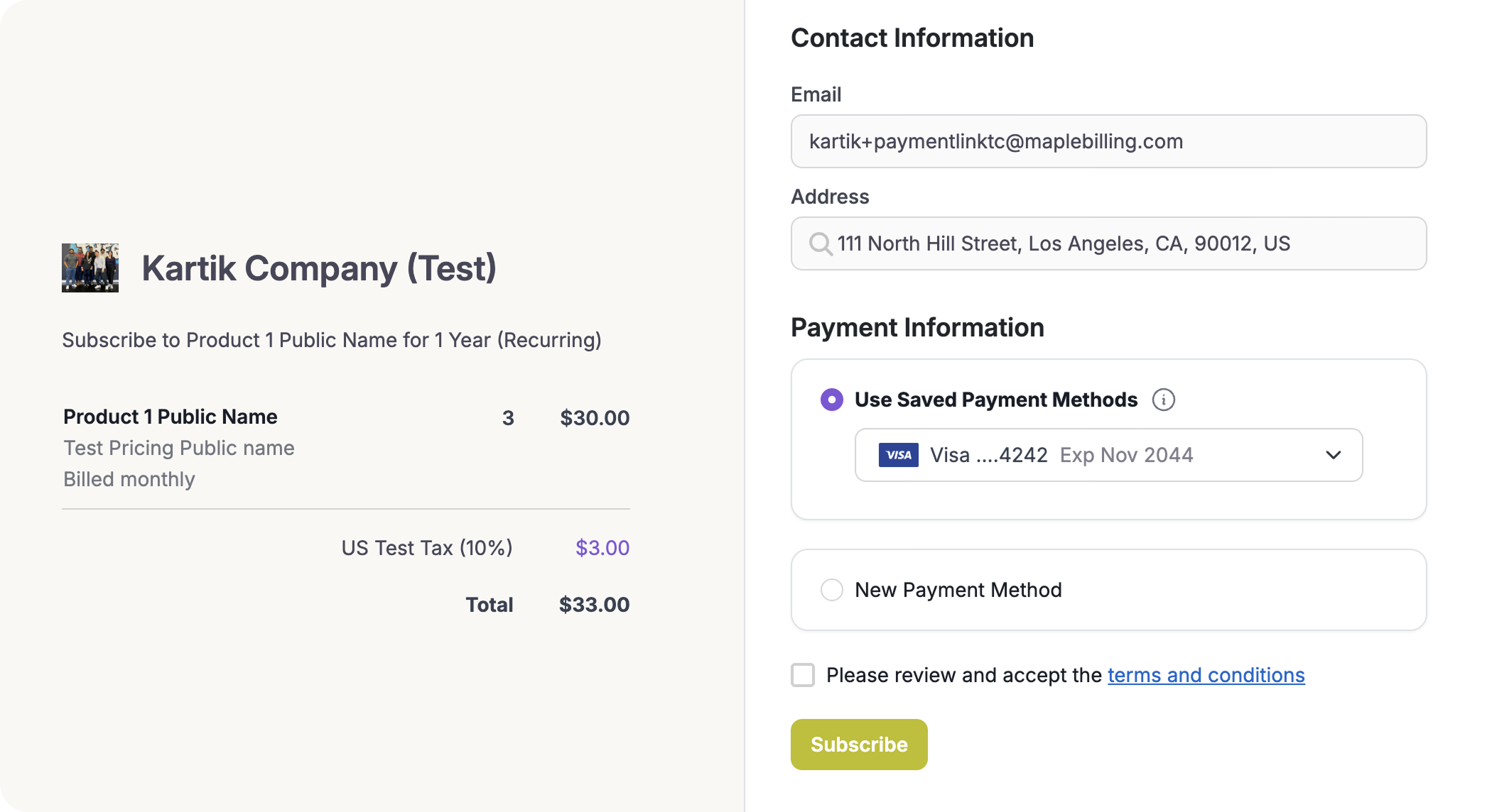 Maple allows you to configure and display specific Terms and Conditions links on your checkout pages associated with Payment Links, Contracts, and Checkout Sessions.