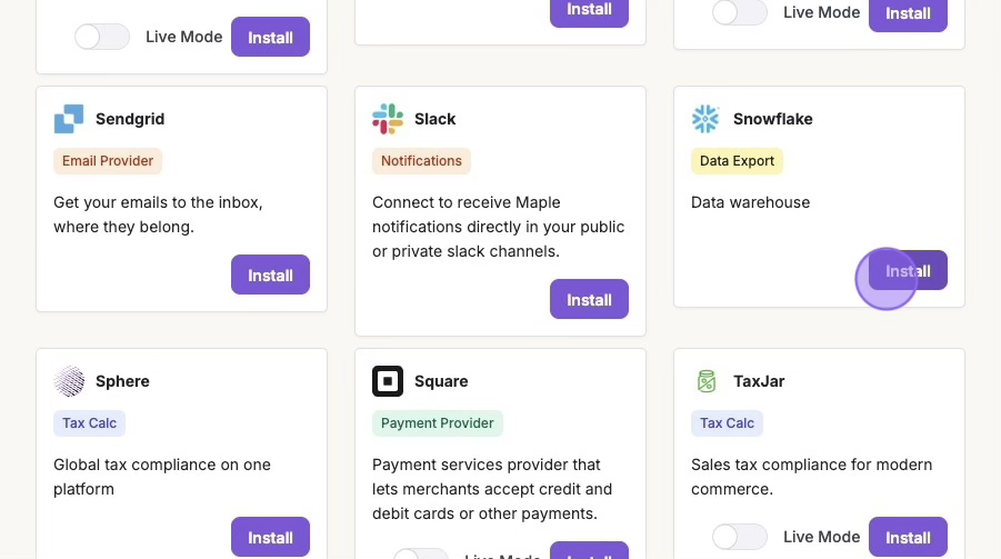Maple connects to your analytics stack to keep your BI and operations in sync. You can export analytics‑ready datasets to your data warehouse (for example, Snowflake, BigQuery) to power reporting, dashboards, and revenue analysis.
